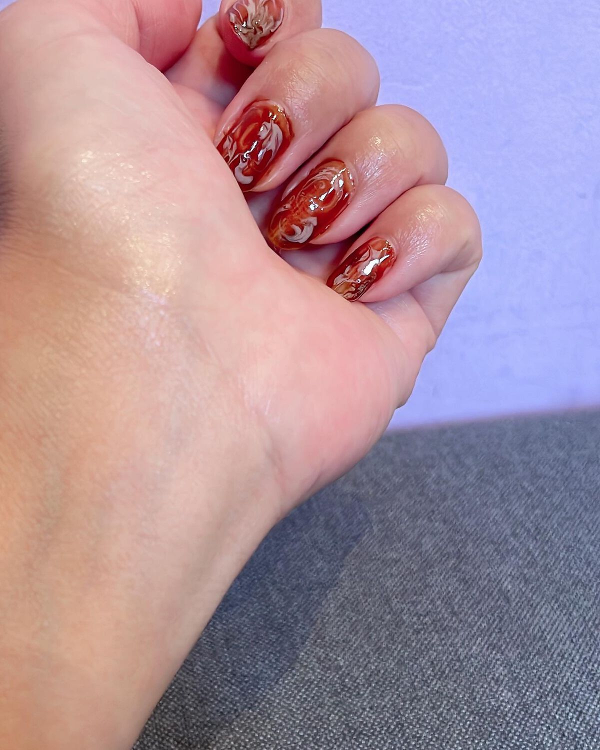 1度塗りでも、煌めきが綺麗でローズベージュの仕上がり。2度塗りはブロンズ感でパケカラー✨ 見える角度や光の加減でも、オレンジぽかったり、ゴールド強めだったり、自分の指先が可愛いすぎる( ́•ૢ⌔•ૢ ̀)♡ プロ用製品だから、1度塗りでも鮮やかな発色と煌めきで、特別に長持ちするように開発✨ ハケもラウンド型で甘皮ギリギリまで、綺麗に塗れる🙌 重ねてもヨレ、ムラ、縦じわもなく、ほんと、不器用な私でも、簡単にキレイにできたよ~~~💓 使う人への健康に配慮し、マニキュアに含まれがちな健康に害を及ぼす恐れがある10種類の化学物質を含まず、ヴィーガン・クルエルティーフリーなのも、魅力的✨✨💫✨✨ いつも使っているネイルより少しお高めだけど、納得の実力だった✨🥇🏆✨ 片手塗ってるうちに乾くほど速乾なのも嬉しい💛 ·͜·♡ 人気な理由わかるし、激推し☝️🙂💡