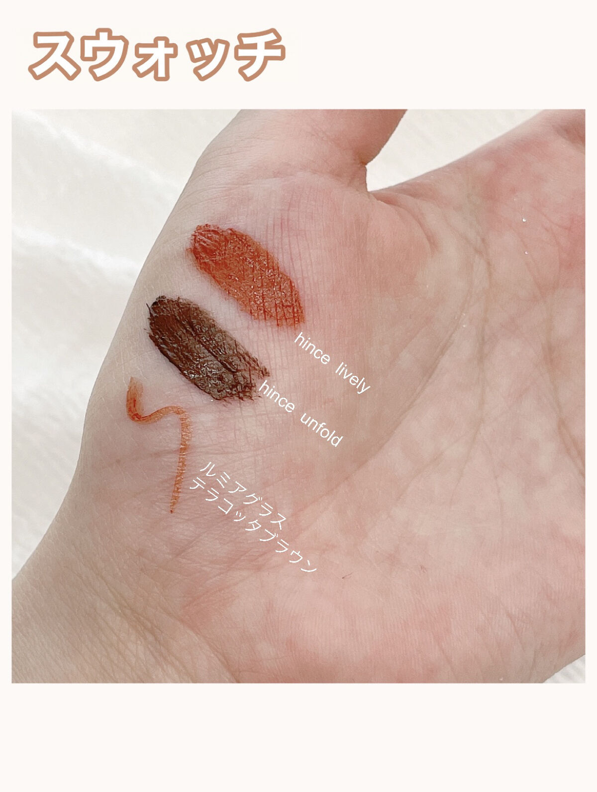 みずみずしくて、スルスル塗れる所がお気に入り😍 グラデーションリップにも挑戦したいな✨ お気に入りカラーはナチュラルピンク、キャメルオレンジ、ピンクベージュ🎀 ティッシュオフしてもツヤは残ってた👀🌟🌟 ノーマルカメラで2度塗りまでスウォッチしたよ🌸色味の参考にどうぞ😌