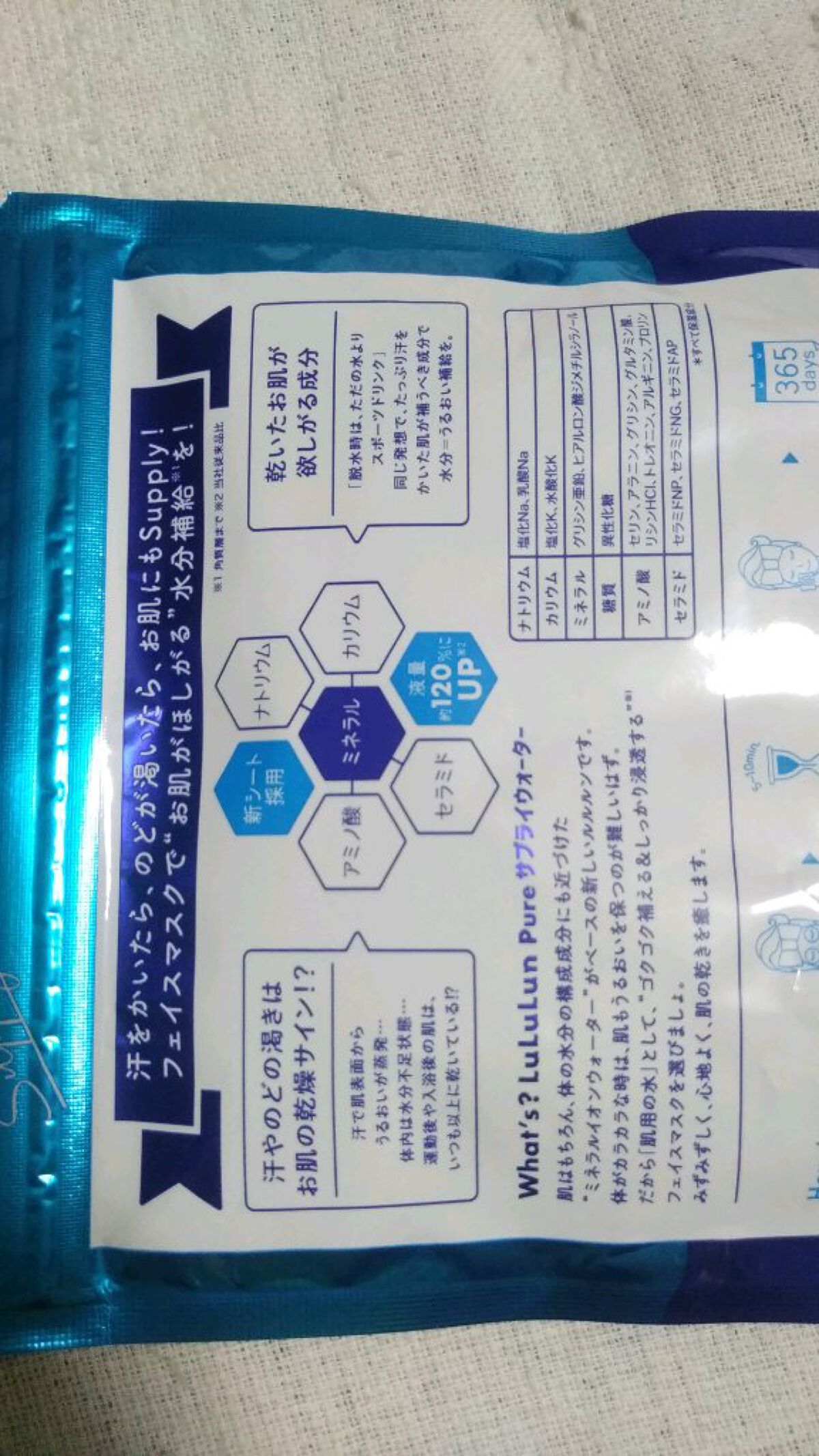 - のどが渇けばお肌も乾く!お肌はもちろん、体の水分構成成分にも近づけた“ミネラルウォーター”がベースの新発想のルルルンが登場。 運動、入浴、サウナの後など、汗をかいていつも以上に乾いたお肌に「肌用の水」として。 乾いたお肌が欲しがる成分をフェイスマスクで効率よく水分補給※1。 液量約120%にUP※2のふんわり軽やかなさわり心地の新シートが、お肌を心地よく、みずみずしくうるおします。 (※1角質層まで ※2当社従来品比)