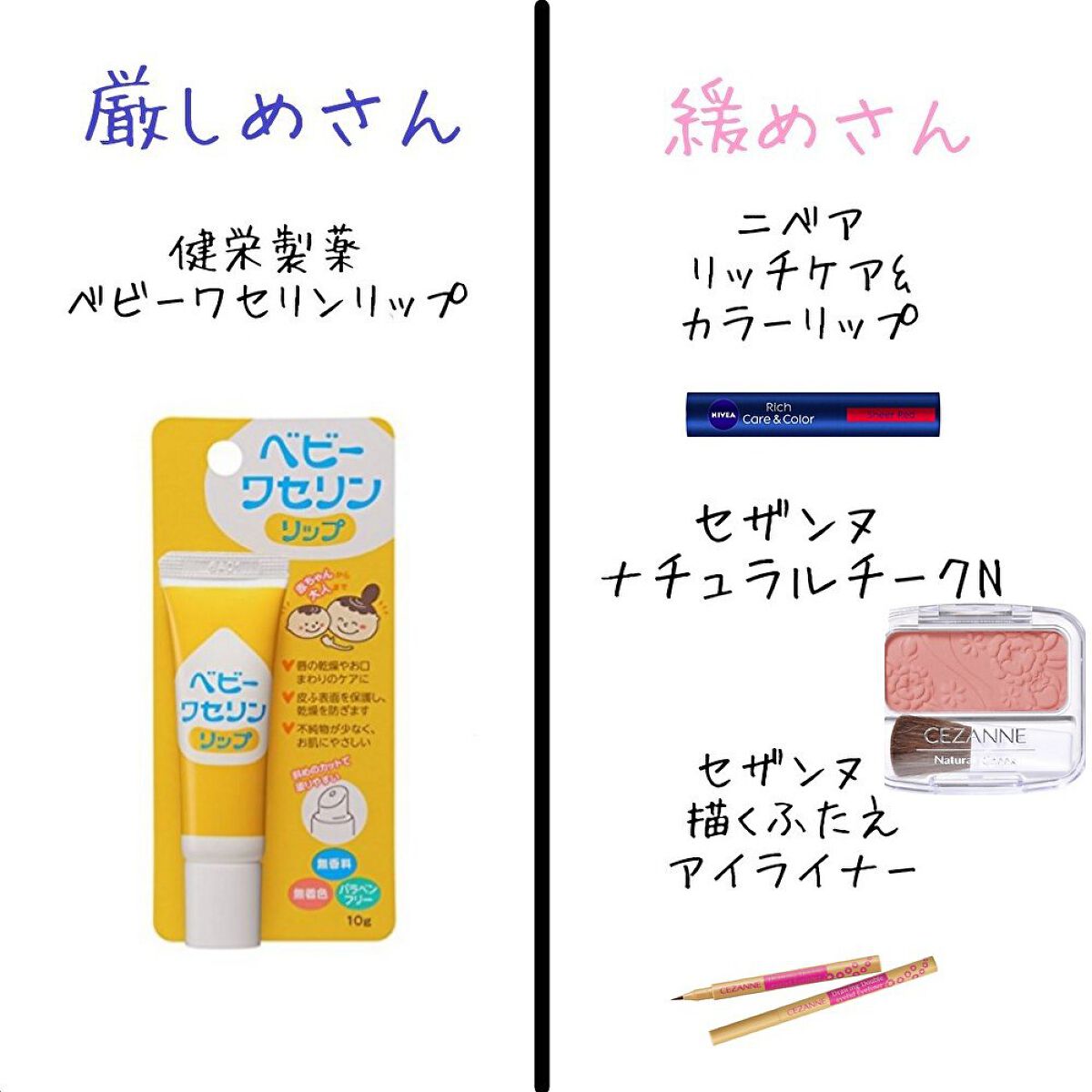 ベースは日焼け止めを塗るのと フェイスパウダーをつけるのくらいで大丈夫です! ビューラーは自分の目にフィットするものを使ってください! キャンメイクのコンシーラーの代わりは今全力で探してます…! ワセリンリップは夜の保湿ケアにも大活躍します! ニベアは普通のメイクでも使える万能リップです!