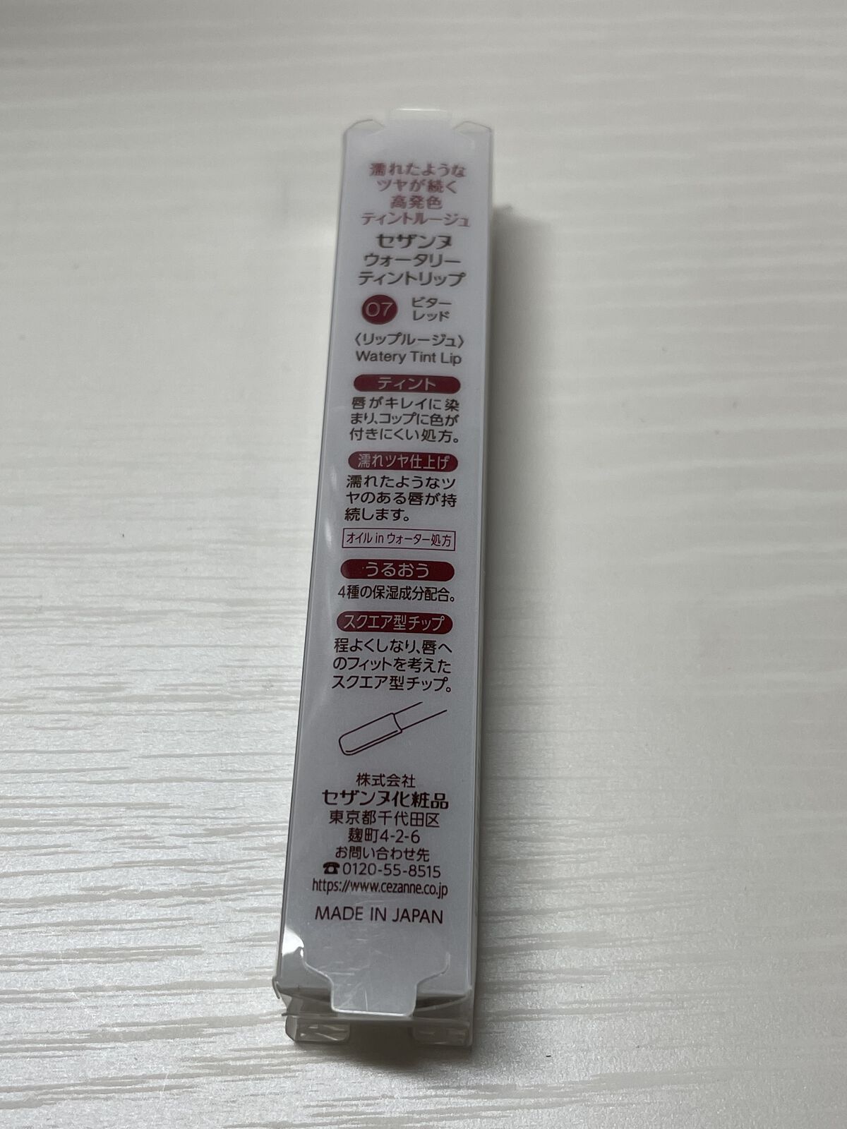 - ツヤ×色×潤いをキープする、セザンヌの新濡れツヤリップ みずみずしい濡れツヤ感ある仕上がりで、発色とツヤが長続きするティントリップです。ティントの発色を透明のベールで覆うリップコートのような処方で、ツヤ感と色をキープします。さらに、唇表面のべたつきは少なく、しっとり潤うオイルinウォーター処方を採用しています。