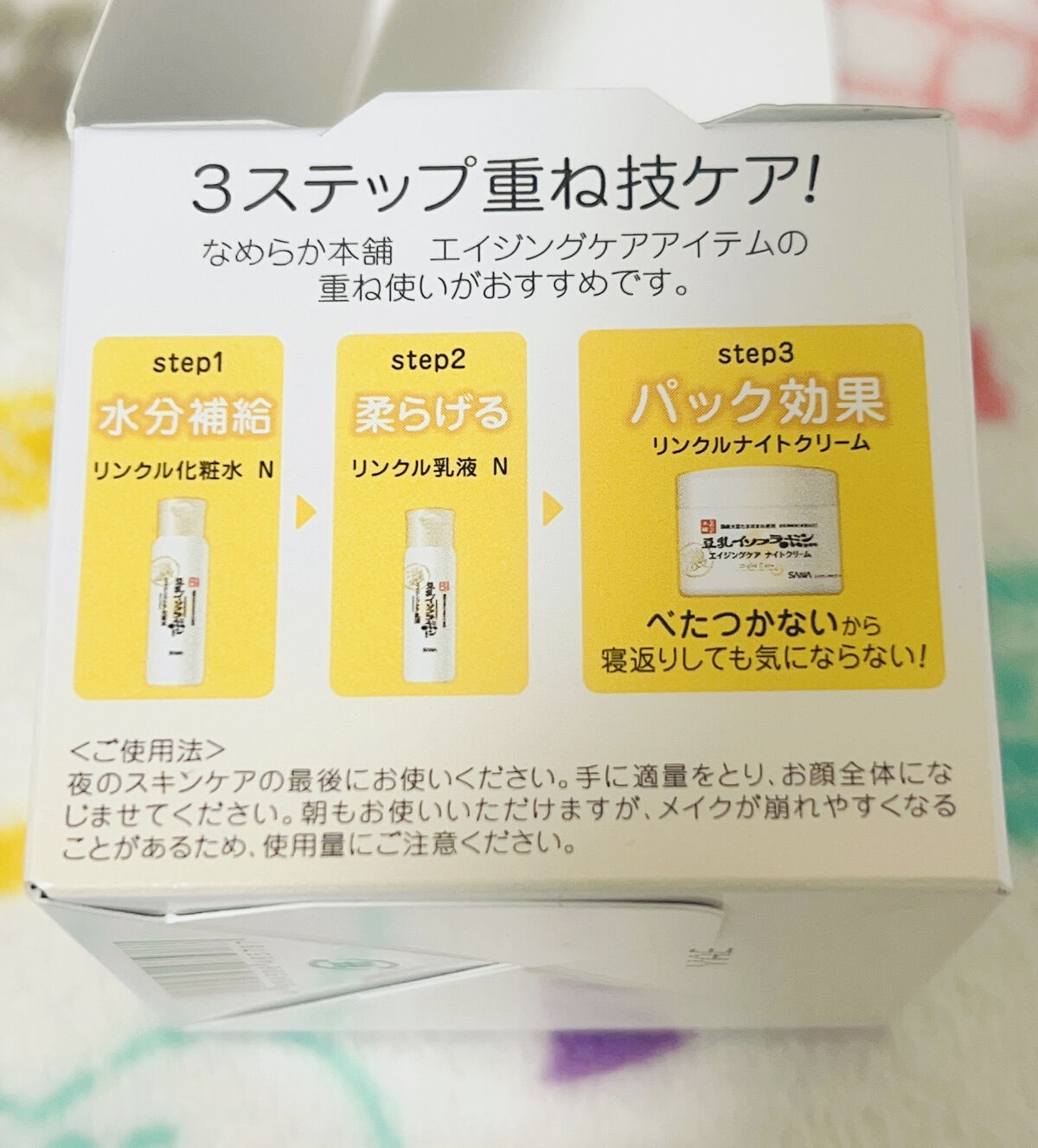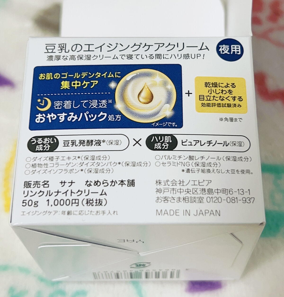 - リンクルラインからナイトクリームが新登場! ピュアレチノール*1を新配合の濃厚クリームが一晩かけて密着して浸透*2する、おやすみパック処方です。 商品特徴 〔 ①ピュアレチノール*1×豆乳発酵液*1配合で本格スキンケア 〕 『なめらか本舗』オリジナルのイソフラボン含有の豆乳発酵液*1に加え、ピュアレチノール*1を新配合! お肌にハリ・弾力感を与えます。 〔 ②夜のしっかりケアで乾燥による小じわを目立たなくします*3! 〕 肌ストレスの少ない夜のお手入れをおすすめします。 新登場のナイトクリームはおやすみパック処方を採用し、濃厚なクリームが一晩中肌に密着しつつ、乾燥による小じわ目立たなくします。 〔 ③3ステップの重ね技ケア! 〕 化粧水、乳液も新テクスチャーで保湿感がパワーアップ! リンクルライン3品一緒に使用するのがおすすめです。 *1 保湿成分 *2 角層まで *3 効能評価試験済み