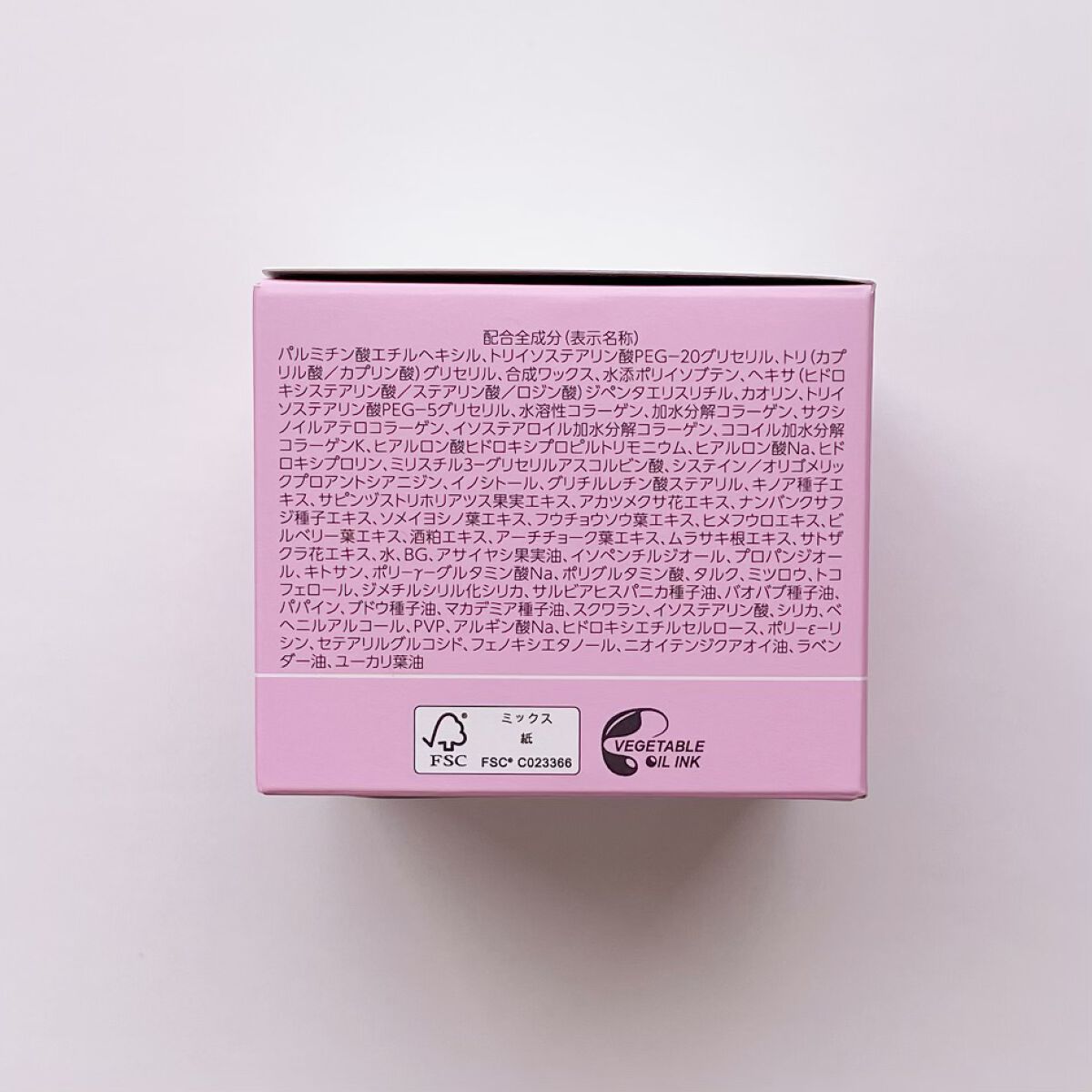 - <75g> パルミチン酸エチルヘキシル、トリイソステアリン酸PEG-20グリセリル、トリ(カプリル酸/カプリン酸)グリセリル、合成ワックス、水添ポリイソブテン、ヘキサ(ヒドロキシステアリン酸/ステアリン酸/ロジン酸)ジペンタエリスリチル、カオリン、トリイソステアリン酸PEG-5グリセリル、水溶性コラーゲン、加水分解コラーゲン、サクシノイルアテロコラーゲン、イソステアロイル加水分解コラーゲン、ココイル加水分解コラーゲンK、ヒアルロン酸ヒドロキシプロピルトリモニウム、ヒアルロン酸Na、ヒドロキシプロリン、ミリスチル3-グリセリルアスコルビン酸、システイン/オリゴメリックプロアントシアニジン、イノシトール、グリチルレチン酸ステアリル、キノア種子エキス、サピンヅストリホリアツス果実エキス、アカツメクサ花エキス、ナンバンクサフジ種子エキス、ソメイヨシノ葉エキス、フウチョウソウ葉エキス、ヒメフウロエキス、ビルベリー葉エキス、酒粕エキス、アーチチョーク葉エキス、ムラサキ根エキス、サトザクラ花エキス、水、BG、アサイヤシ果実油、イソペンチルジオール、プロパンジオール、キトサン、ポリ-γ-グルタミン酸Na、ポリグルタミン酸、タルク、ミツロウ、トコフェロール、ジメチルシリル化シリカ、サルビアヒスパニカ種子油、バオバブ種子油、パパイン、ブドウ種子油、マカデミア種子油、スクワラン、イソステアリン酸、シリカ、ベヘニルアルコール、PVP、アルギン酸Na、ヒドロキシエチルセルロース、ポリ-ε-リシン、セテアリルグルコシド、フェノキシエタノール、ニオイテンジクアオイ油、ラベンダー油、ユーカリ葉油