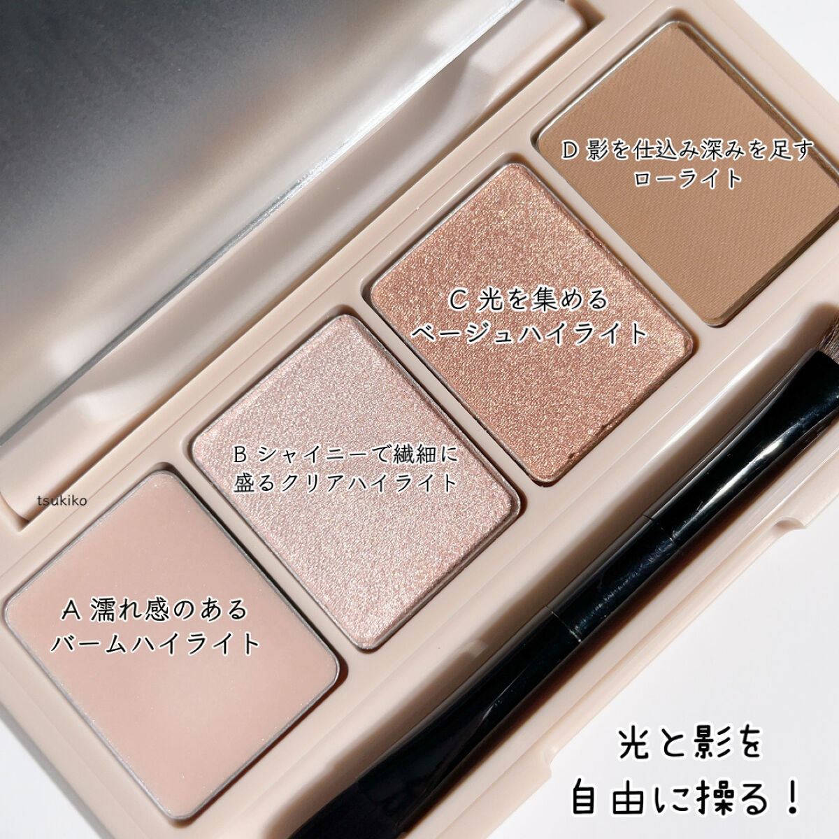 - ※フジコの足しパレは4色で目元をつくるパレットではありません。 捨て色なし。使える4色パレットなら、“ひと塗りで ほら、可愛い。” 可愛さ溢れる足し算メイクで視線にインパクト。 使える色だけ4色集めたFujiko初のアイパレットが登場。単色でも重ねてもシアーな彫り深に。 ひと塗りで、明るさの中に影を仕込む、印象的なアイメイクが簡単に。 ひと塗りで、じんわりとした“深み”と“レイヤード” 単色はもちろん、お手持ちのシャドウに重ねて足しても 足しパレ同士を重ねて足しても溢れる可愛さ無限。 【04彫り深ヌード 光と影】 A:濡れ感のあるバームハイライト B:シャイニーで繊細に盛るクリアハイライト C:スポットライトのように光を集めるベージュハイライト D:影を仕込み深みを足すローライト ※B・Cはオイルを多めに含んだ密着度が高い滑らかなパウダー。 【05抜け感アイブロウ】 A:ナチュラルブラウン(マット) 簡単に眉毛全体を上手に描ける高発色処方。 高密着オイルパウダー×多孔質パウダー配合で、粉飛びしにくく発色長時間キープ。 B:ライトベージュ(パール) 眉毛の野暮ったさを抜き、抜け感と透明感を演出。 繊細なホワイトパール(※1)の質感で、眉毛の色味をふわっと優しい印象に。 ▼カラーチェンジャー(印象を変え好みの雰囲気に仕上げる) C:可愛さ宿るニュアンスオレンジ(パール) レッドパール(※1)の輝きで、可愛さ溢れる柔らかい表情にチェンジ。 D:美人度格上げモーヴバイオレット(パール) ピンクパール(※1)の煌めきで、キリッと美人モードにチェンジ。 ※1 真珠光沢顔料配合