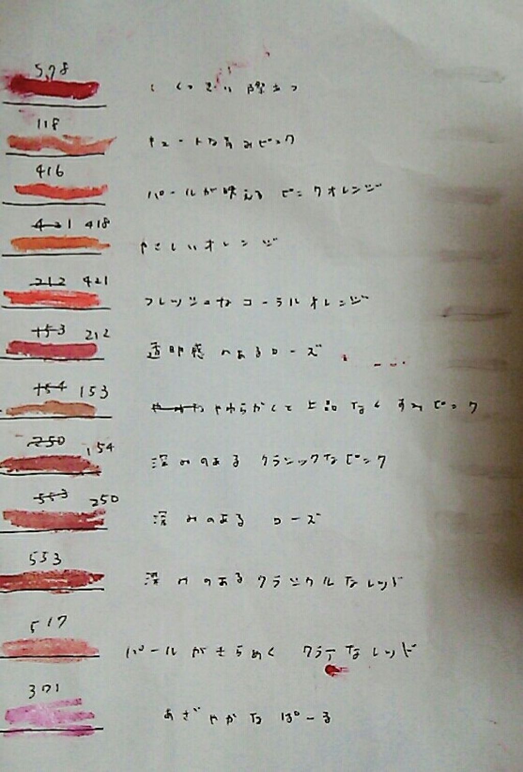 - <118 ピンク系> 着色成分 酸化チタン適量、〃 酸化鉄適量、〃 マイカ適量、〃 黄5適量、〃 赤202適量、〃 グンジョウ適量、〃 硫酸Ba適量、油性エモリエント成分 オクチルドデカノール11.43%、〃 トリエチルヘキサノイン10.40%、〃 ヘキシルデカノール8.32%、〃 パラフィン8.31%、〃 リンゴ酸ジイソステアリル6.24%、〃 マイクロクリスタリンワックス4.18%、〃 ミツロウ2.31%、〃 カルナウバロウ1.85%、〃 マカデミア種子油1.04%、成分の酸化防止剤 BHT適量、基剤 ヒマシ油全量を100%とする <132 ピンク系> 着色成分 酸化チタン適量、〃 酸化鉄適量、〃 赤202適量、〃 マイカ適量、〃 硫酸Ba適量、〃 青1適量、油性エモリエント成分 オクチルドデカノール11.50%、〃 トリエチルヘキサノイン10.50%、〃 パラフィン9.08%、〃 ヘキシルデカノール8.39%、〃 リンゴ酸ジイソステアリル6.28%、〃 マイクロクリスタリンワックス4.41%、〃 カルナウバロウ1.95%、〃 ミツロウ1.91%、〃 マカデミア種子油1.00%、保湿成分 ヒアルロン酸Na0.20%、基剤 ヒマシ油全量を100%とする <133 ピンク系> 着色成分 酸化チタン適量、〃 酸化鉄適量、〃 赤201適量、〃 マイカ適量、〃 青1適量、油性エモリエント成分 オクチルドデカノール11.49%、〃 トリエチルヘキサノイン10.49%、〃 パラフィン8.64%、〃 ヘキシルデカノール8.38%、〃 リンゴ酸ジイソステアリル6.27%、〃 マイクロクリスタリンワックス4.19%、〃 ミツロウ2.10%、〃 カルナウバロウ1.86%、〃 マカデミア種子油1.00%、保湿成分 ヒアルロン酸Na0.20%、表面処理剤 水酸化Al適量、製品の酸化防止剤 トコフェロール0.02%、成分の酸化防止剤 BHT適量、基剤 ヒマシ油全量を100%とする <134 ピンク系> 着色成分 酸化チタン適量、〃 酸化鉄適量、〃 マイカ適量、〃 赤201適量、〃 赤202適量、〃 黄5適量、〃 硫酸Ba適量、〃 酸化スズ適量、〃 青1適量、油性エモリエント成分 オクチルドデカノール11.49%、〃 トリエチルヘキサノイン10.49%、〃 パラフィン8.67%、〃 ヘキシルデカノール8.39%、〃 リンゴ酸ジイソステアリル6.29%、〃 マイクロクリスタリンワックス4.20%、〃 ミツロウ2.00%、〃 カルナウバロウ1.87%、〃 マカデミア種子油1.00%、保湿成分 ヒアルロン酸Na0.20%、表面処理剤 水酸化Al適量、製品の酸化防止剤 トコフェロール0.02%、成分の酸化防止剤 BHT適量、基剤 ヒマシ油全量を100%とする <136 ピンク系パール> 着色成分 マイカ適量、〃 酸化チタン適量、〃 酸化鉄適量、〃 黄5適量、〃 赤202適量、〃 硫酸Ba適量、〃 シリカ適量、〃 青1適量、油性エモリエント成分 オクチルドデカノール11.50%、〃 トリエチルヘキサノイン10.50%、〃 パラフィン8.93%、〃 ヘキシルデカノール8.40%、〃 リンゴ酸ジイソステアリル6.30%、〃 マイクロクリスタリンワックス4.21%、〃 ミツロウ2.00%、〃 カルナウバロウ1.90%、〃 マカデミア種子油1.00%、保湿成分 ヒアルロン酸Na0.20%、表面処理剤 水酸化Al適量、製品の酸化防止剤 トコフェロール0.02%、成分の酸化防止剤 BHT適量、基剤 ヒマシ油全量を100%とする <154 ピンク系> 着色成分 酸化鉄適量、〃 酸化チタン適量、〃 黄5適量、〃 マイカ適量、〃 赤202適量、〃 赤201適量、〃 青1適量、〃 硫酸Ba適量、油性エモリエント成分 オクチルドデカノール11.04%、〃 トリエチルヘキサノイン10.04%、〃 ヘキシルデカノール8.03%、〃 パラフィン8.02%、〃 リンゴ酸ジイソステアリル6.03%、〃 マイクロクリスタリンワックス4.03%、〃 ミツロウ2.23%、〃 カルナウバロウ1.79%、〃 マカデミア種子油1.00%、保湿成分 ヒアルロン酸Na0.20%、表面処理剤 水酸化Al適量、製品の酸化防止剤 トコフェロール0.02%、成分の酸化防止剤 BHT適量、基剤 ヒマシ油全量を100%とする <212 ローズ系パール> 着色成分 酸化鉄適量、〃 酸化チタン適量、〃 マイカ適量、〃 赤202適量、〃 黄5適量、〃 青1適量、〃 硫酸Ba適量、油性エモリエント成分 オクチルドデカノール11.51%、〃 トリエチルヘキサノイン10.51%、〃 パラフィン8.66%、〃 ヘキシルデカノール8.39%、〃 リンゴ酸ジイソステアリル6.28%、〃 マイクロクリスタリンワックス4.20%、〃 ミツロウ2.01%、〃 カルナウバロウ1.87%、〃 マカデミア種子油1.00%、保湿成分 ヒアルロン酸Na0.20%、表面処理剤 水酸化Al適量、製品の酸化防止剤 トコフェロール0.02%、成分の酸化防止剤 BHT適量、基剤 ヒマシ油全量を100%とする <250 ローズ系パール> 着色成分 酸化鉄適量、〃 酸化チタン適量、〃 マイカ適量、〃 赤202適量、〃 青1適量、〃 硫酸Ba適量、油性エモリエント成分 オクチルドデカノール10.87%、〃 トリエチルヘキサノイン9.89%、〃 ヘキシルデカノール7.91%、〃 パラフィン7.89%、〃 リンゴ酸ジイソステアリル5.94%、〃 マイクロクリスタリンワックス3.96%、〃 ミツロウ2.20%、〃 カルナウバロウ1.76%、〃 マカデミア種子油0.99%、保湿成分 ヒアルロン酸Na0.20%、表面処理剤 水酸化Al適量、製品の酸化防止剤 トコフェロール0.02%、成分の酸化防止剤 BHT適量、基剤 ヒマシ油全量を100%とする <256 ローズ系パール> 着色成分 酸化鉄適量、〃 酸化チタン適量、〃 マイカ適量、〃 黄5