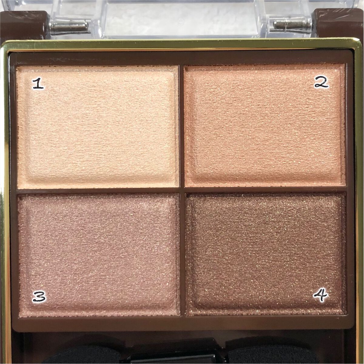 全体的には、名前のとおりヌーディーな印象☺️定番色「01 本命のブラウン」と似てるんだけど、今回の「104 本能のヌードベージュ」の方が、よりヌーディーなカラーとなっておりまする💁🏻♀️ 左上のベージュカラー(1番)は、基本的にはマットカラーなんだけど、ほんのりラメも入ってるから、のっぺりとした印象にならなくて良き🥰 4番のカラーは、ハイライトとして使うこともできるし、個人的には涙袋に使っても良いのではないかと思っておりまする👻 こちらは、全体的にしっとりとしたテクスチャーとなっておりまする💖そして、上2色のマットカラーが、結構しっかり発色してくれます❣️ 右下のハイライトカラーも、「104 本能のヌードベージュ」ほど白っぽくならないので、さりげなくハイライトを入れたい人にピッタリ✨