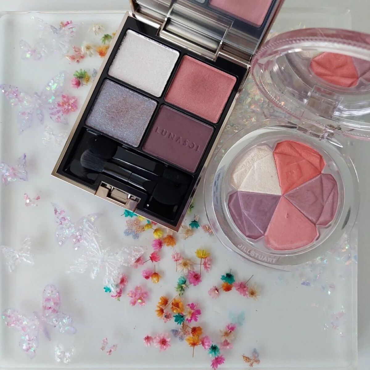 RMKのアイシャドウはこれがデビュー。こんなんブルベホイホイじゃん…。かわいすぎて即予約電話したわ🫠🩷 青みピンクに透明感爆発パープルにキラキララメ。締め色はグレージュっぽいブラウン。ブルベ大歓喜。 発色は調整しやすい。ピンクも見た目はビビッドだけど、ふんわり色づくので、好みの濃さにできるよ。