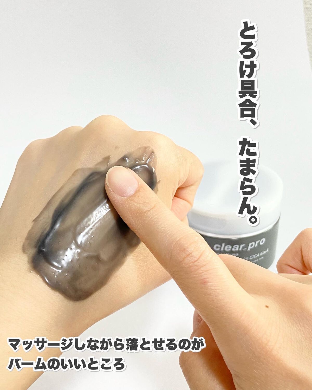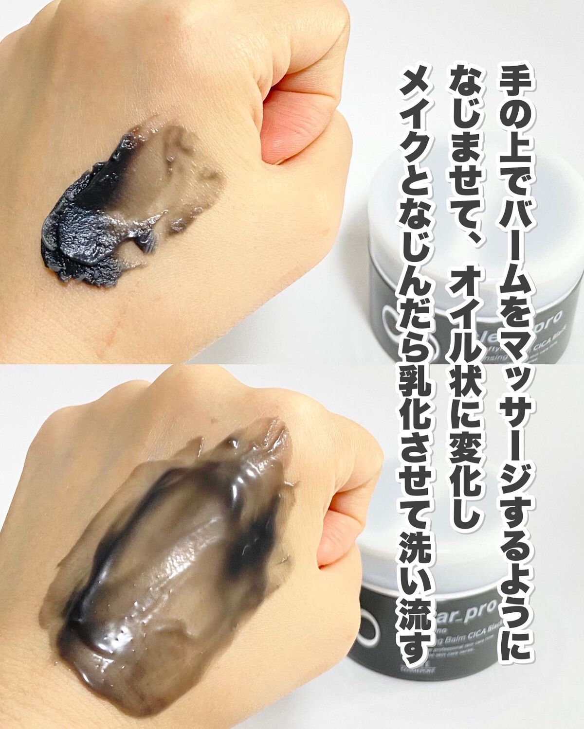 - 毛穴の黒ずみ・皮脂・ベタつきごっそりOFF! "落とすたび 肌うるおう"クレンジングバーム CICA ブラック ♥Piont1:"落とすたび肌うるおう"スキンケアするCICAクレンジングバーム メイクを落とすたび角層水分量アップ! クレンジングしながらうるおいスキンケアできる、新感覚CICAクレンジングバーム。 ♥Piont2:極上のとろけ感で みるみるなじむ 重曹(洗浄成分)※1・炭(皮脂吸着)、ツボクサエキス※2・ドクダミエキス・5種の植物油脂※3(保湿)を配合し、毛穴の黒ずみ・皮脂・ベタつきを吸着除去。落とす前よりうるおったすべすべ肌に。 ♥Piont3:1品7役の多機能オールインワンバーム 1品7役(うるおいケア、クレンジング、洗顔、毛穴ケア、角質クリア、マッサージ効果、トリートメント効果※4)のオールインワンタイプ。 ※1 炭酸水素Na ※2 ツボクサ葉エキス ※3 オリーブ果実油・ゴマ種子油・サフラワー油・シア脂・ホホバ種子油 ※4 メイク汚れなどを除去してキメを整えること