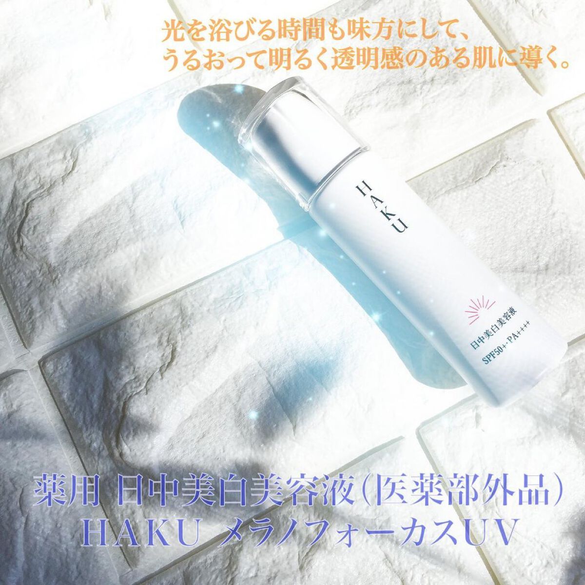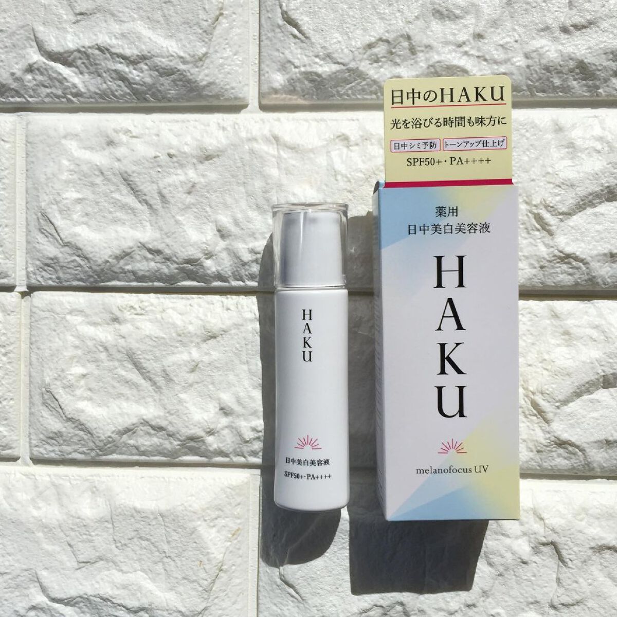 - 販売名「メラノフォーカスUV」 SPF50+・PA++++ 日中のHAKU。光を浴びる時間も味方に、日中だからできる美白ケアのアプローチ。 シミ予防研究の先端技術を搭載し、日中ならではの美白ケアを可能にした、薬用日中美白美容液です。光を浴びる時間も味方にして、明るく透明感のある肌に導きます。 ○2種の美白有効成分を肌の奥まで届け効かせる。 ○日中の肌環境に着目し、Wデイエフェクターを配合。うるおいを与え届ける。 〇ファインレッドパールαが効果的に光を放ち、シミや色ムラを目立たせない。トーンアップ効果で、明るく透明感のある仕上がり。 〇みずみずしい美容液がスーッとなじむ。化粧下地としても使える。 ○無香料・アレルギーテスト済み・ニキビのもとになりにくい処方。 (全てのかたにアレルギーが起きない、ニキビができないというわけではありません)。