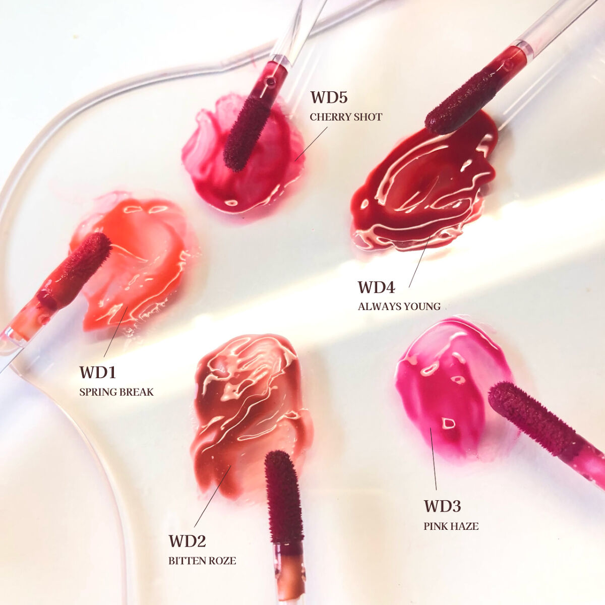 - <WD2 ビトゥン ローズ> 水、ジフェニルジメチコン、リンゴ酸ジイソステアリル、ビスジグリセリルポリアシルアジペート-2、水添ポリイソブテン、ジグリセリン、DPG、セチルPEG/PPG-10/1ジメチコン、イソステアリン酸ソルビタン、ポリソルベート60、ペンチレングリコール、オクチルドデカノール、セテアレス-20、(アクリル酸ヒドロキシエチル/アクリロイルジメチルタウリンNa)コポリマー、スクワラン、フェノキシエタノール、ポリグリセリン-3、ステビオシド、香料、エチルヘキシルグリセリン、グリセリン、シア脂、ツバキ種子油、トリ(カプリル酸/カプリン酸)グリセリル、アルガニアスピノサ核油、ホホバ種子油、アーモンド油、アンズ核油、月見草油、オリーブ果実油、テトラ(ジ-t-ブチルヒドロキシヒドロケイヒ酸)ペンタエリスリチル、カニナバラ果実エキス、マンゴー果実エキス、赤104(1)、赤227、黄5、青1 <WD3 ピンク ヘイズ> 水、ジフェニルジメチコン、リンゴ酸ジイソステアリル、ビスジグリセリルポリアシルアジペート-2、水添ポリイソブテン、ジグリセリン、DPG、セチルPEG/PPG-10/1ジメチコン、イソステアリン酸ソルビタン、ポリソルベート60、ペンチレングリコール、オクチルドデカノール、セテアレス-20、(アクリル酸ヒドロキシエチル/アクリロイルジメチルタウリンNa)コポリマー、スクワラン、フェノキシエタノール、ポリグリセリン-3、ステビオシド、香料、エチルヘキシルグリセリン、グリセリン、水酸化Al、ポリアクリル酸アンモニウム、BG、アルガニアスピノサ核油、シア脂、ツバキ種子油、トリ(カプリル酸/カプリン酸)グリセリル、アーモンド油、アンズ核油、ホホバ種子油、月見草油、オリーブ果実油、テトラ(ジ-t-ブチルヒドロキシヒドロケイヒ酸)ペンタエリスリチル、マンゴー果実エキス、カニナバラ果実エキス、酸化チタン、赤104(1)、赤227、黄5、青1 <WD4 オールウェイズ ヤング> 水、ジフェニルジメチコン、リンゴ酸ジイソステアリル、ビスジグリセリルポリアシルアジペート-2、水添ポリイソブテン、ジグリセリン、DPG、セチルPEG/PPG-10/1ジメチコン、イソステアリン酸ソルビタン、ポリソルベート60、ペンチレングリコール、オクチルドデカノール、セテアレス-20、(アクリル酸ヒドロキシエチル/アクリロイルジメチルタウリンNa)コポリマー、スクワラン、フェノキシエタノール、ポリグリセリン-3、ステビオシド、香料、エチルヘキシルグリセリン、グリセリン、シア脂、ツバキ種子油、トリ(カプリル酸/カプリン酸)グリセリル、アルガニアスピノサ核油、ホホバ種子油、アーモンド油、アンズ核油、月見草油、オリーブ果実油、テトラ(ジ-t-ブチルヒドロキシヒドロケイヒ酸)ペンタエリスリチル、カニナバラ果実エキス、マンゴー果実エキス、赤104(1)、赤227、黄5、青1 <WD6 クラッシュド パンプキン> 水、水添ポリイソブテン、リンゴ酸ジイソステアリル、ビスジグリセリルポリアシルアジペート-2、ジフェニルシロキシフェニルトリメチコン、ジフェニルジメチコン、ポリグリセリン-3、オクチルドデカノール、ポリソルベート60、セチルPEG/PPG-10/1ジメチコン、ラウリン酸ポリグリセリル-10、ペンチレングリコール、1,2-ヘキサンジオール、(アクリル酸ヒドロキシエチル/アクリロイルジメチルタウリンNa)コポリマー、PEG-60水添ヒマシ油、セテアリルアルコール、スクワラン、キシリトール、エチルヘキシルグリセリン、香料、ポリアクリル酸アンモニウム、イソステアリン酸ソルビタン、水酸化Al、フェノキシエタノール、BG、トコフェロール、酸化チタン、酸化鉄、赤227、黄4、黄5、青1 <WD8 ビンテージ カラント> 水、水添ポリイソブテン、リンゴ酸ジイソステアリル、ビスジグリセリルポリアシルアジペート-2、ジフェニルシロキシフェニルトリメチコン、ジフェニルジメチコン、オクチルドデカノール、ポリグリセリン-3、ポリソルベート60、セチルPEG/PPG-10/1ジメチコン、ラウリン酸ポリグリセリル-10、1,2-ヘキサンジオール、ペンチレングリコール、(アクリル酸ヒドロキシエチル/アクリロイルジメチルタウリンNa)コポリマー、PEG-60水添ヒマシ油、セテアリルアルコール、スクワラン、キシリトール、エチルヘキシルグリセリン、香料、イソステアリン酸ソルビタン、トコフェロール、赤104(1)、赤227、黄5、青1 <WD9 ミスター ストレンジャー> 水、水添ポリイソブテン、リンゴ酸ジイソステアリル、ビスジグリセリルポリアシルアジペート-2、ジフェニルシロキシフェニルトリメチコン、ジフェニルジメチコン、オクチルドデカノール、ポリグリセリン-3、ポリソルベート60、セチルPEG/PPG-10/1ジメチコン、ラウリン酸ポリグリセリル-10、1,2-ヘキサンジオール、ペンチレングリコール、(アクリル酸ヒドロキシエチル/アクリロイルジメチルタウリンNa)コポリマー、セテアリルアルコール、PEG-60水添ヒマシ油、スクワラン、キシリトール、エチルヘキシルグリセリン、香料、イソステアリン酸ソルビタン、水酸化Al、ポ