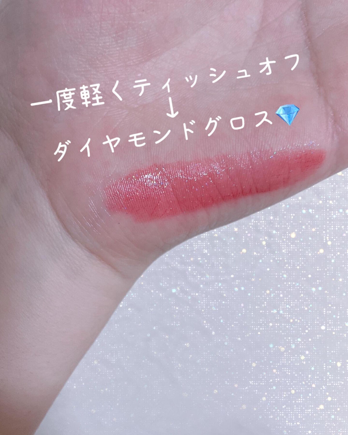 落ちないリップ😍🫶🏻 発色かなりいいのに マスクにも付きづらくて 感動しました🥺 落ちない、乾かない 艶が絶妙にあって好き💖 香りはふんわりローズ系 の匂いでした✨ 私は人中メイクにぴったりだと 思います!唇の山に少し乗せると 韓国ぽリップが簡単にできます👄 他の色も試してみたくなる パケも可愛いお気に入りリップです🖤 ダイヤモンドグロスも こちらに合わせてみたくて 一緒に購入。 ベタベタしないテクスチャーで 凄く軽い! 少し気分を変えて キラッキラにしたい時に1つ あると便利です😍