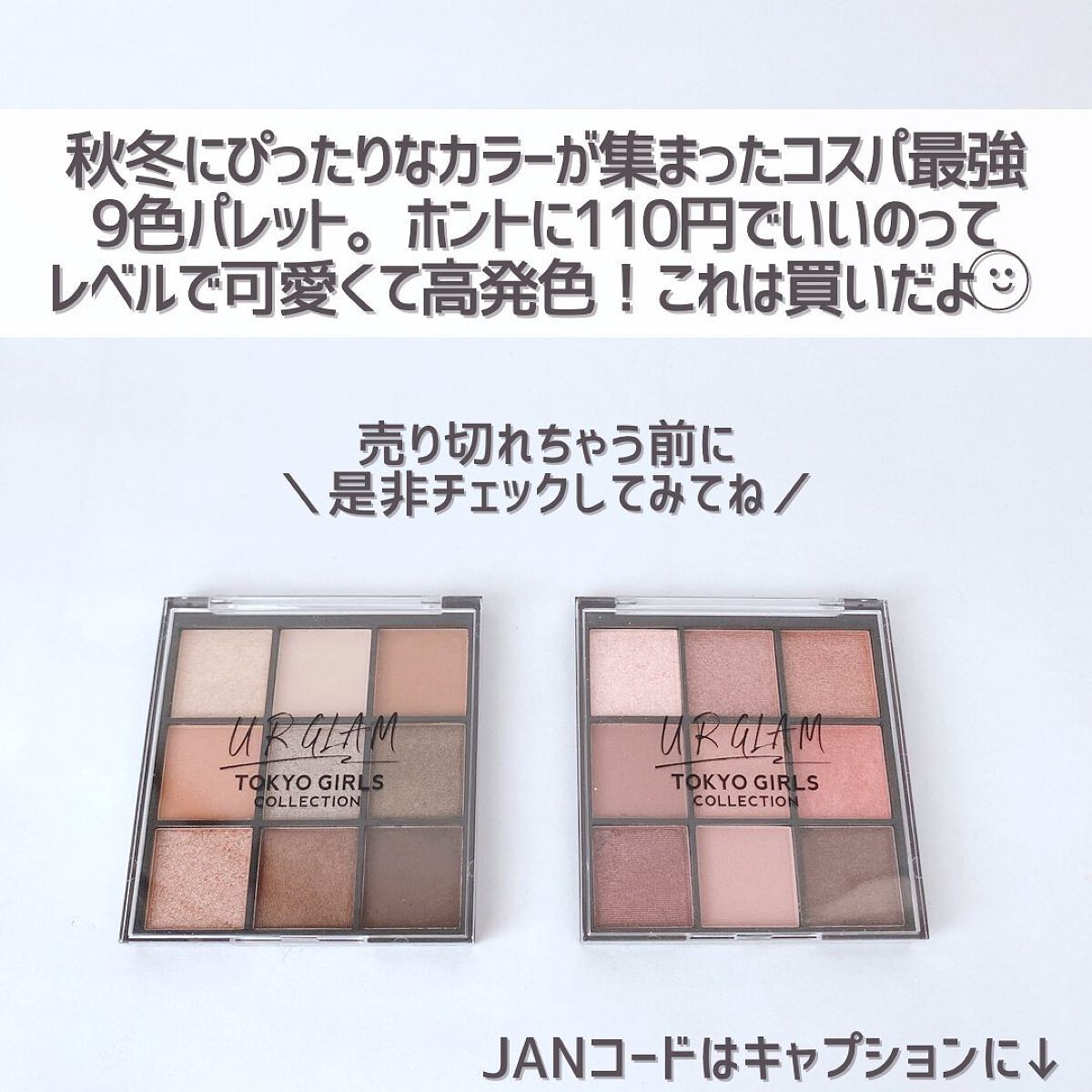 U R GLAMと東京ガールズコレクション(TGC)とのコラボコスメ♡ ベリー系のトレンドカラーを9色詰め込んだ、ドットデザインが可愛いアイカラー。 330円というプチプラだけど、粗すぎない粉で密着もそこそこ。凄い!アイシャドウベースとコーティングスプレーを併用しておけば使いやすくなったよ🙆 どのカラーを組み合わせても相性がいい♪上2列はパステルふんわり系、下列はくすみ系に感じたよ〜。