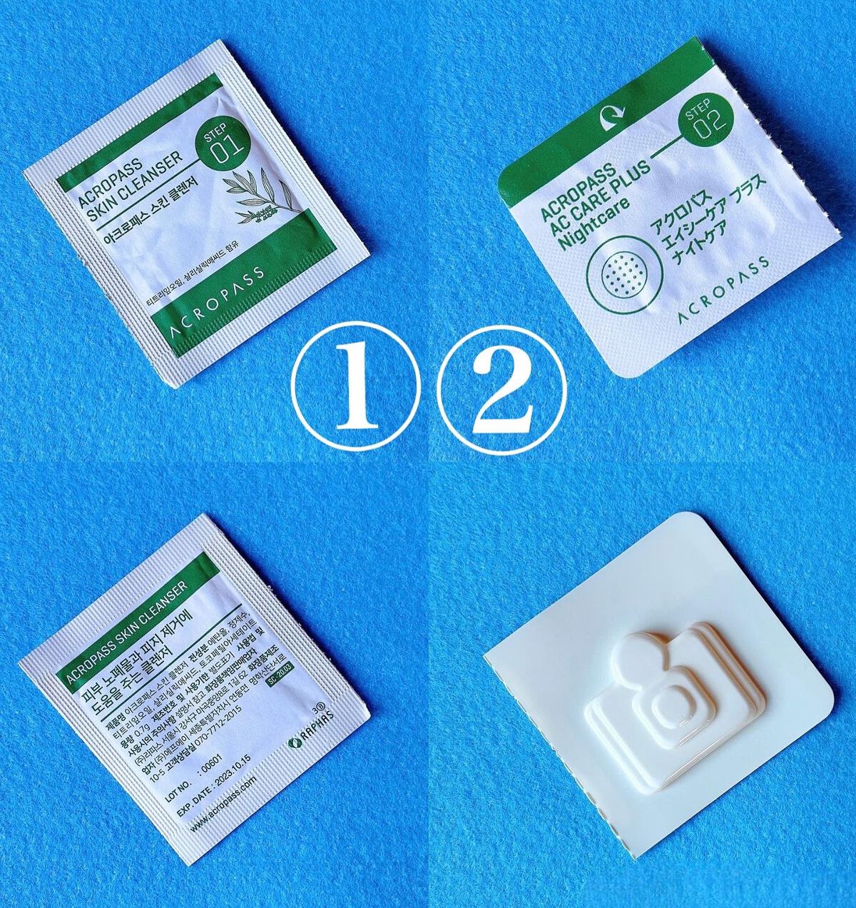 - ●Nightcare用 エイシーケア:ヒアルロン酸Na、ナイアシンアミド、オリゴペプチド-76、水酸化Na クレンザー:エタノール、水、ティーツリー葉油、サリチル酸、酢酸トコフェロール ●Daycare用 デイケアパッチ:ハイドロコロイド素材 、ティーツリー葉油、サリチル酸、酢酸トコフェロール