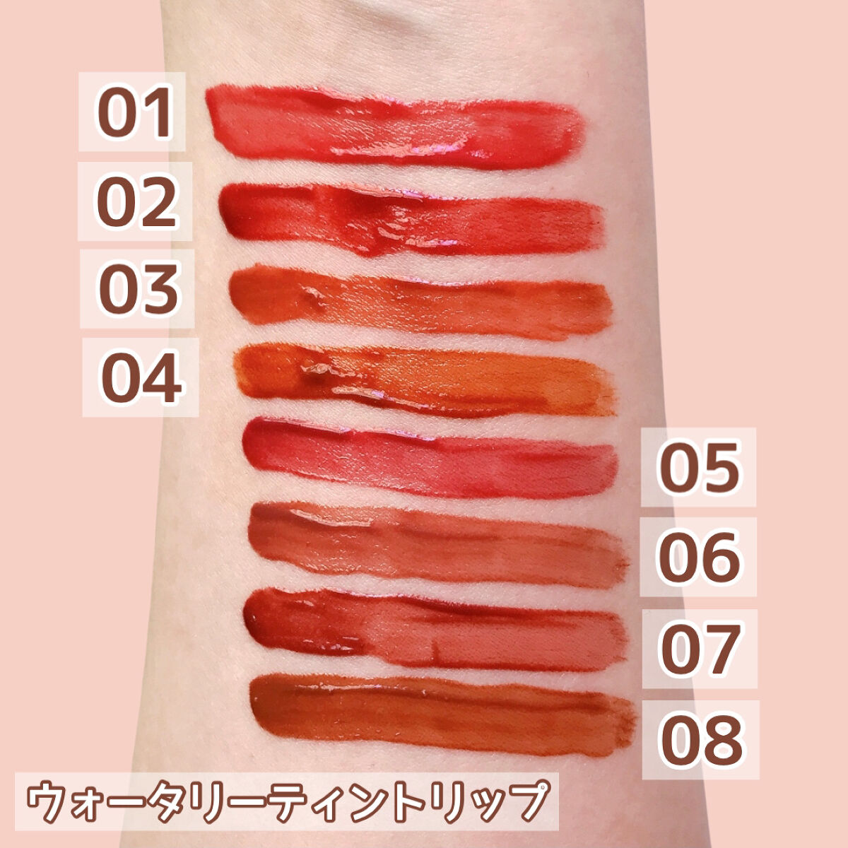 CEZANNEのウォータリーティントリップから新色が出た〜(*˘︶˘*).。.:*♡ということで全色スウォッチいってみたいと思います🙌🏻💕濡れたようなツヤが長時間持続するティントルージュ。水に濡れたような軽やかなツヤが持続✨唇に色がフィットし...