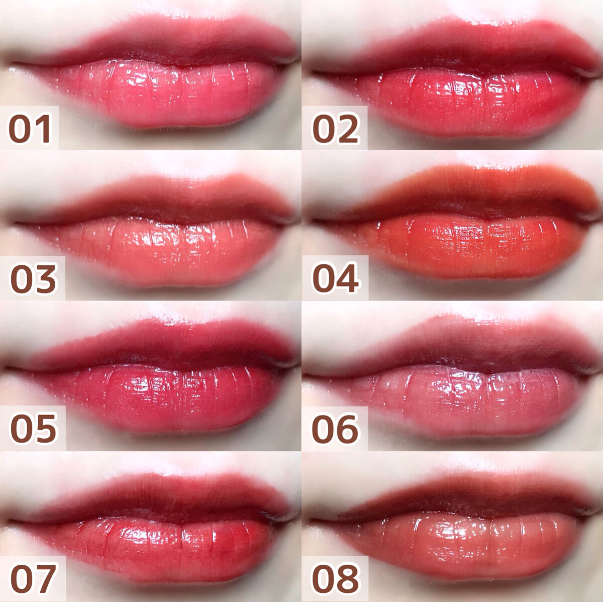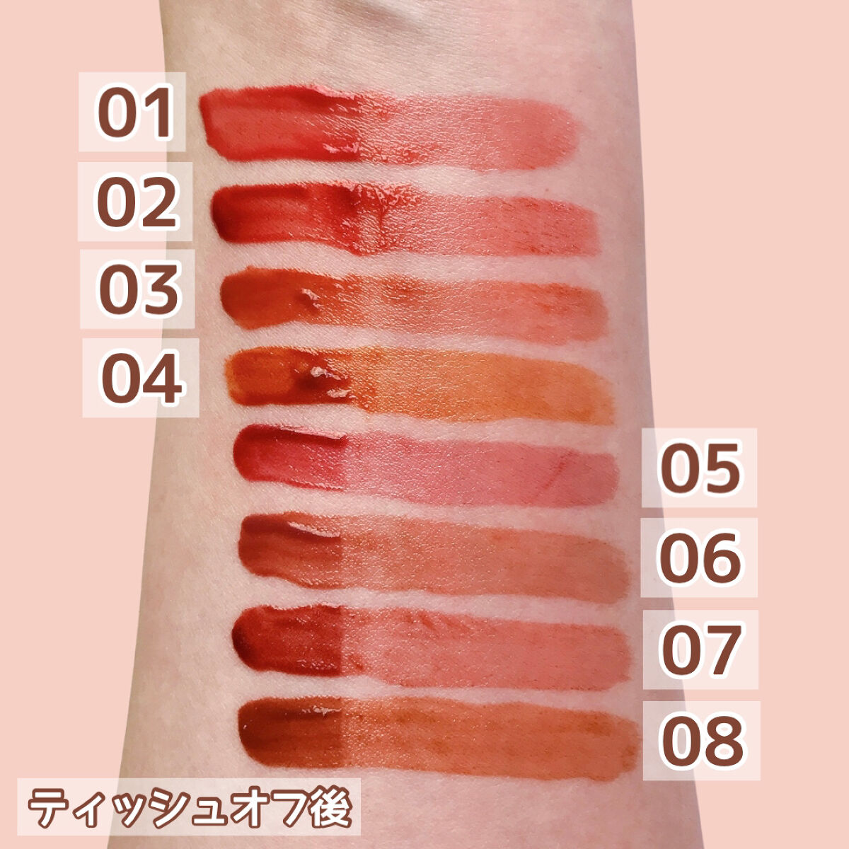 新色は大人かわいい上品な2つのカラー❤️ 06 #ピンクベージュ ナチュラルでどんな場面にも合うような万能なカラー✨ 上品な印象になる仕上がりです💖 07 #ビターレッド 深みのある大人っぽいカラー✨ 華やかな印象になる仕上がりです💖 01 #ナチュラルピンク 女性らしい華やかな印象になるピンク 02 #コーラルレッド 垢抜けたおしゃれな印象になるコーラルレッド 03 #ベージュブラウン 知的で大人っぽい印象になるベージュブラウン 04 #キャメルオレンジ こなれた印象になるオレンジ 05 #プラムレッド 洗練された印象になる青みレッド 色持ちも良くて、ティッシュオフするとマスクにもつきにくくておすすめリップです😊