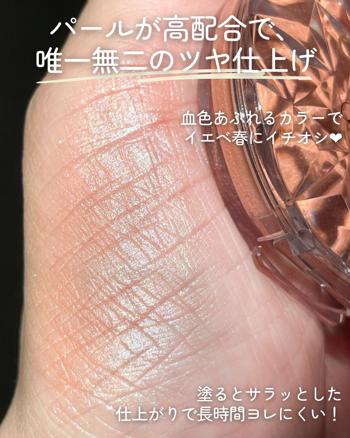 - うるっと艶やかな仕上がりになる、”むにゅっ”と質感の生チーク♥ クリームチークの、ツヤ感のある仕上がりになるパールタイプです。 パールを高配合しているので、濡れたようなツヤ仕上げ♥ ”むにゅっ”とした質感で、お肌にぴたっと密着します。 塗るとサラッとした仕上がりで長時間ヨレにくい! ※充填時に入った気泡が容器底面から点や線状に黒く見えることがありますが、品質上問題はございません。 ※中身の片寄りの原因になりますので、落下などの強い衝撃を与えないでください。