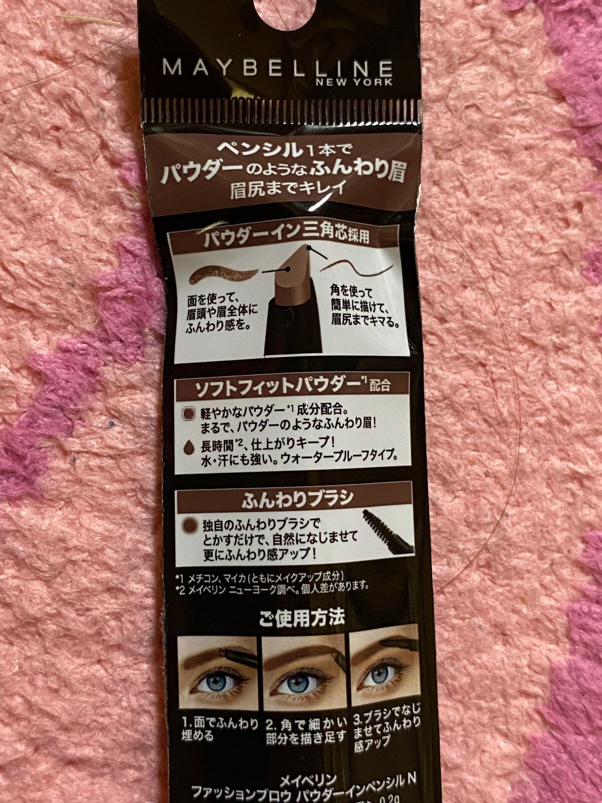 - <2020年3月14日「ファッションブロウ パウダーインペンシル」から「ファッションブロウ パウダーインペンシル N」に名称変更> パウダーのようなふんわり自然な仕上がりなのに、眉毛にしっかり密着、落ちにくい。長時間*²、自然な仕上がりをキープしてくれます。汗・水にも強いウォータープルーフタイプ。 ■1本で様々なラインが自由自在に描ける三角カット芯 角:眉尻もラクラク描き足せる。 表面:眉頭や眉全体に自然な立体感を。 ■・密着パウダー成分配合 描くだけでパウダーのようなふんわりぼかした印象に。しかも眉毛に密着するから長時間*² 仕上がりキープ。 *2 メイベリン ニューヨーク調べ(個人差があります)。