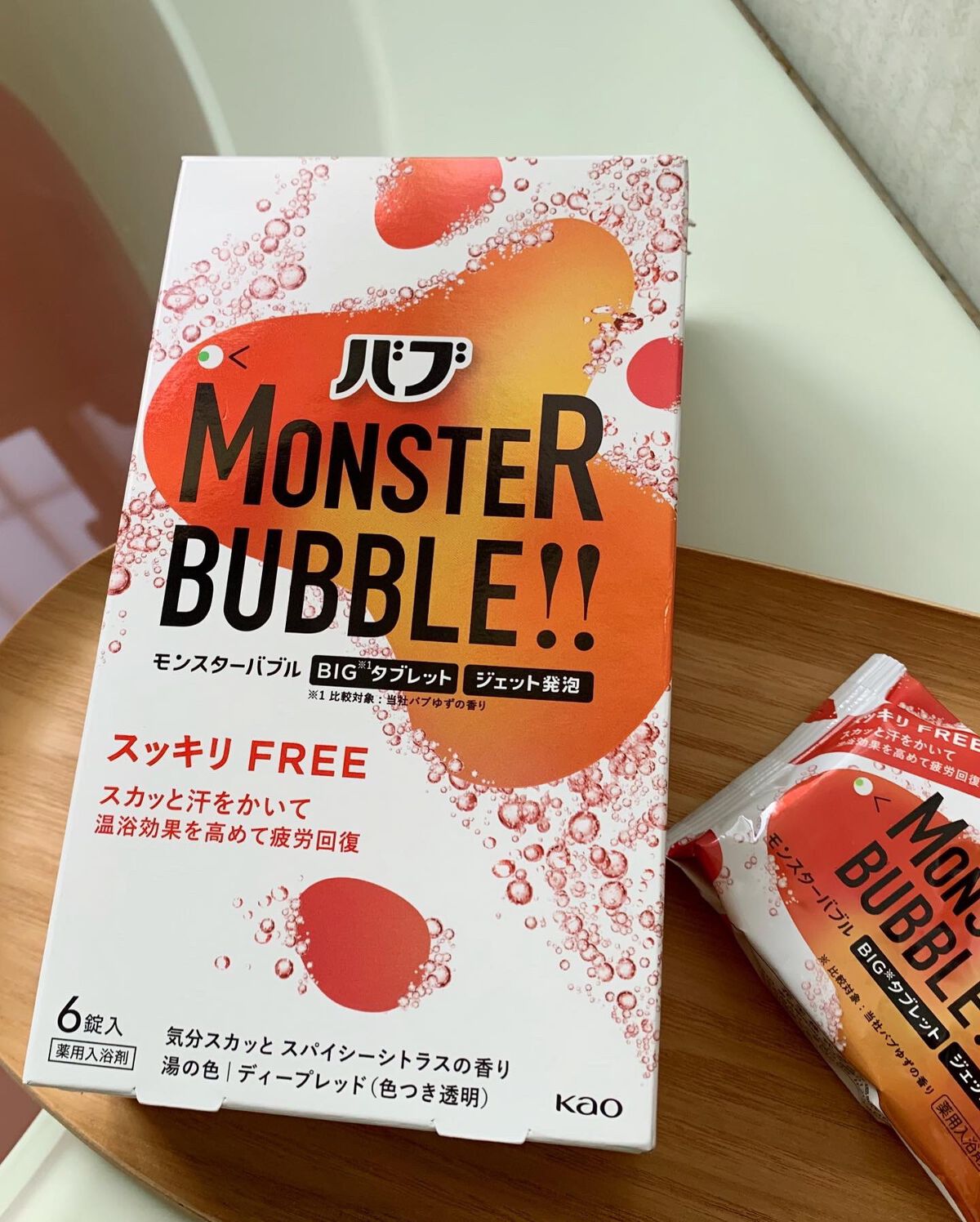 開けてみると、いつも使っていたバブのものより大きなタブレットでした! 湯船に入れると、シュワシュワシュワ〜と発泡。 お湯の色はディープレッド (色つき透明) で、 香りは「気分スカッとスパイシーシトラス」 1箱に6錠入り。 個包装なので、出張の多い夫にも持たせやすいです👌