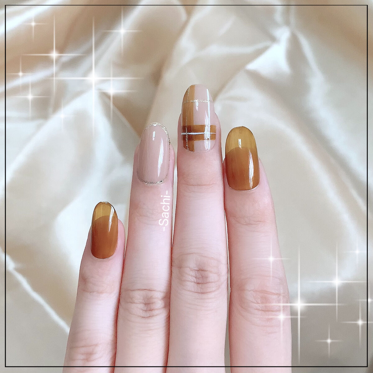 ワンカラーでも指ごとに色を変えるだけでオシャレに見えます💕 画像のようにゴールドラインとストーンを少し足すだけで華やかさがアップ🥰 何度かご紹介したことのあるスポンジで作るグラデーションです✨ スポンジを使うことで境目が綺麗に馴染んでくれます💕 アルミホイルの上でブラウンとトップコートを1:1くらいで混ぜたものを、トップコートのハケに取って3箇所に塗るだけ👌 事前に混ぜたものを塗ることで、爪の上でぼかすより簡単に出来ます💕 ベースカラーが乾く前に点置きしてぼかすことで綺麗にぼかせます✨ スピードが大事なので、使うポリッシュのキャップは全て開けておきましょう😊 天然石のラインはガタガタの方がより天然石っぽく見えるので、ラインを描くのが苦手な方でも大丈夫🙆♀️ 難しそうに見えて、やってみると意外と簡単に出来ます♡