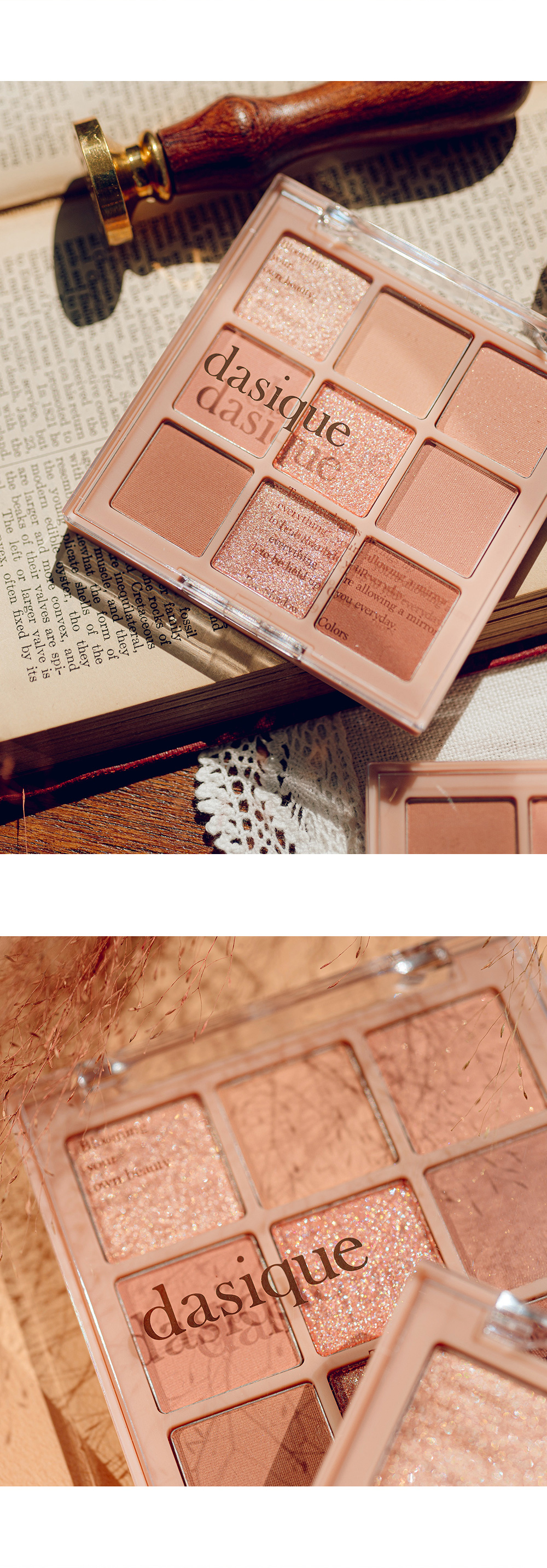 - 【舞台上のバレリーナの繊細な動きと抑制された美しさを再解釈した、dasiqueならではのバレエコアコレクション】 シマー、マット、パールなどバリエーション豊かなテクスチャーで、軽やかにまぶたにフィット。粉飛びしにくく、指先で簡単に美しい仕上がりが叶います。 柔らかいピンクベースから深みのあるシェードまで揃い、1つのパレットで普段使いのデイリーメイクから特別な日の華やかメイクまで幅広く楽しめます。 - 活用しやすいテクスチャーとカラーバリエーションで毎日新しいムードを完成してくれるデイジーク シャドウパレット。 デイリーメイクからポイントメイクまで演出が可能。 感覚的な9種類の色味でムードUP! 多彩でウェアラブルなテクスチャーで高い活用度!