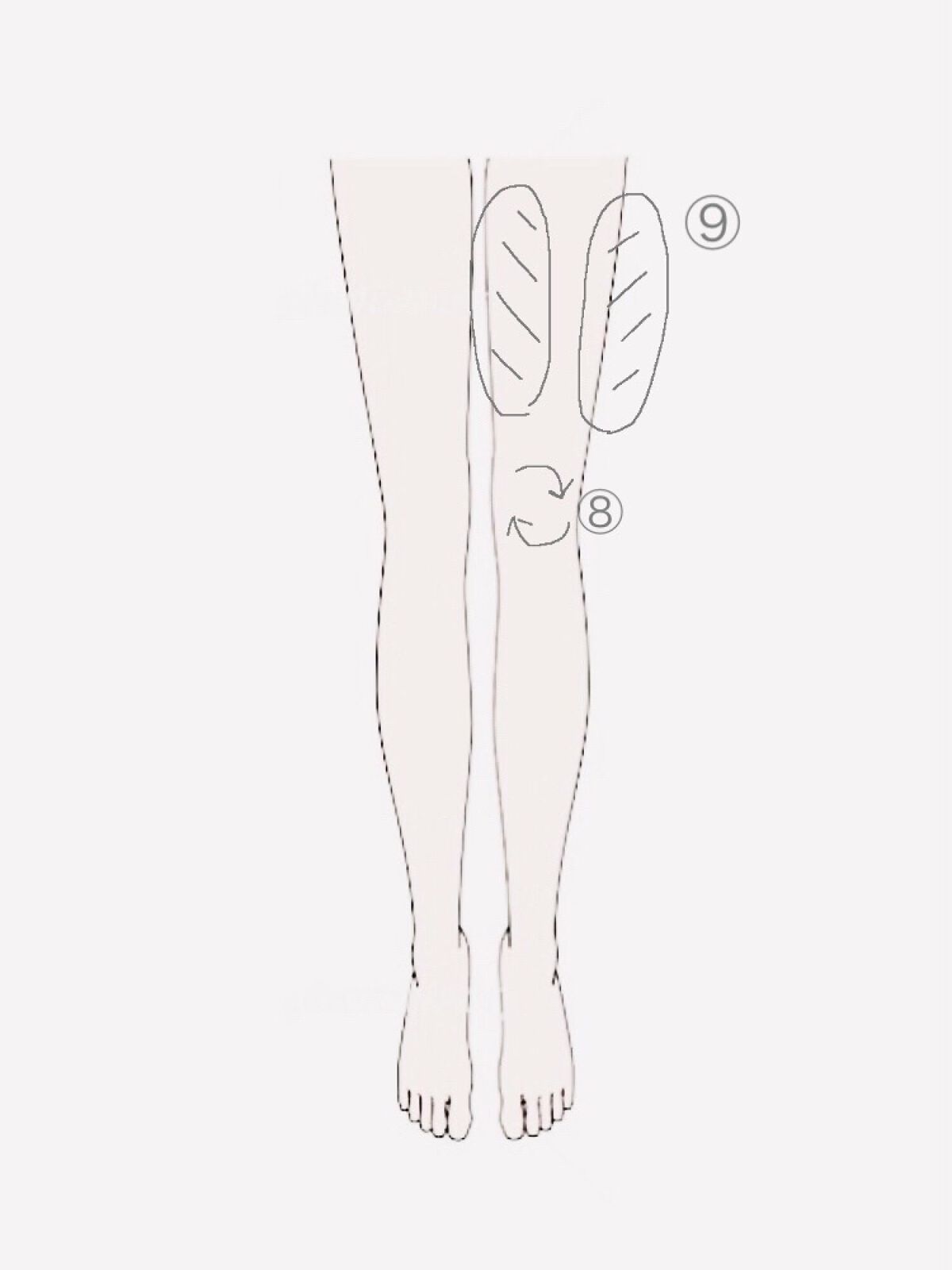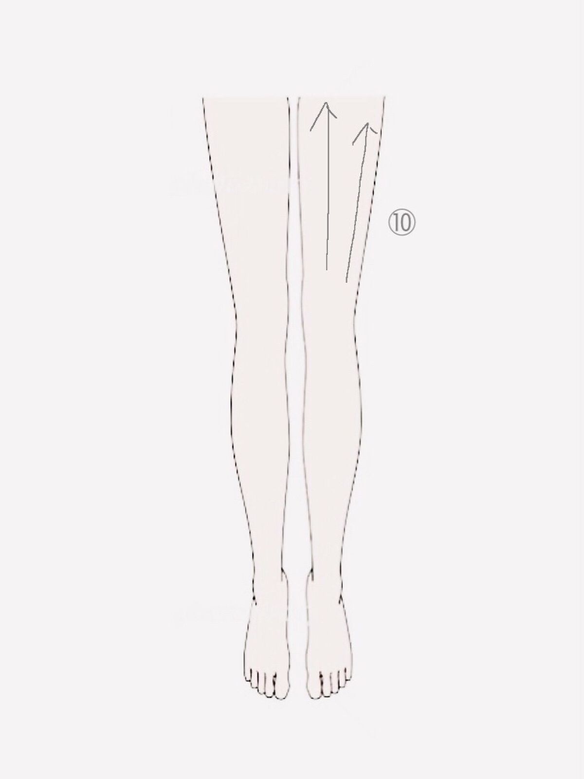 足全体をもみもみ 足の指の間をもみもみ ふくらはぎをもみもみ 矢印の方向に絞る ③のところから膝までをぐーの手でスライド 膝のお肉をもみもみ ぐーの手で膝周りをグリグリ 外側と内側の太ももをもみもみ 膝上から太ももの付け根までぐーの手でスライド 太ももの付け根をプッシュ