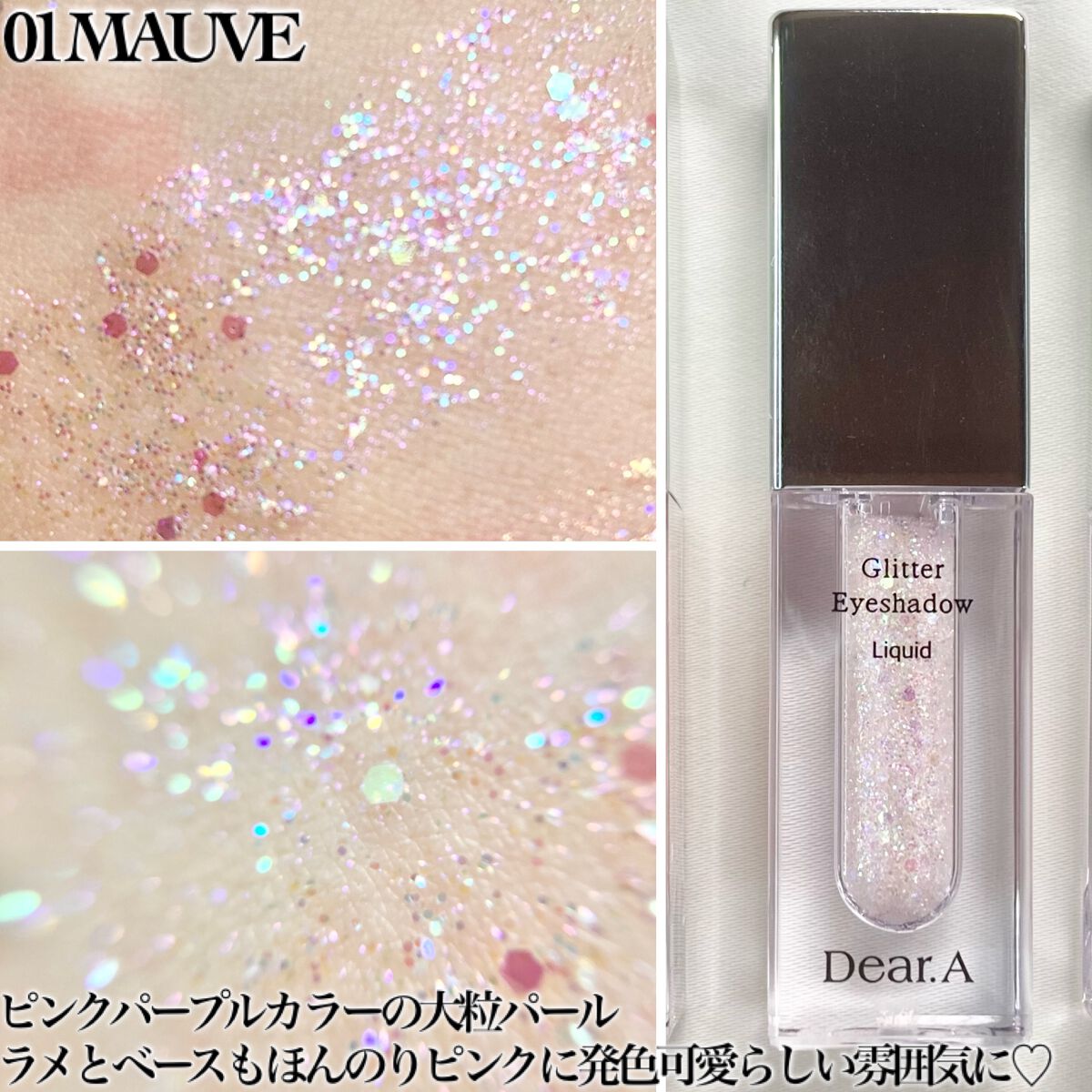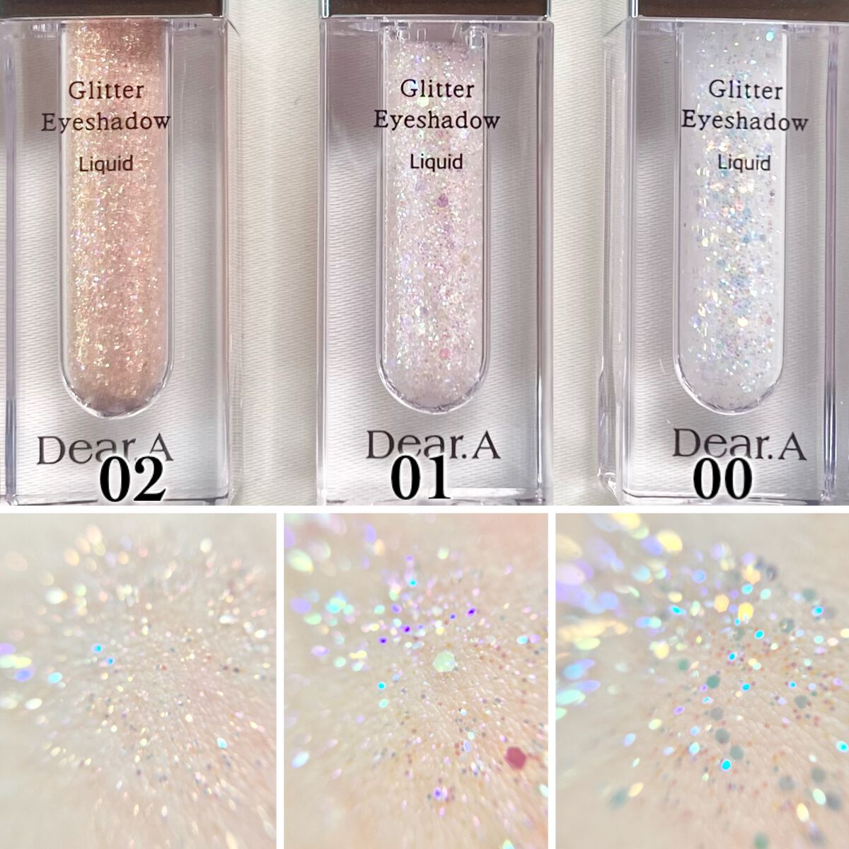 Dear.Aグリッターアイシャドウ3色うるちゅる+きらきらな発色00と01は大粒ホログラムが入っていて、02は他2色と比べてぎっしり細かいラメ入り。どれも輝きが綺麗で00はブルー、01はピンク、02はコーラルオレンジ特に01のピンクが好み🫶ピ...
