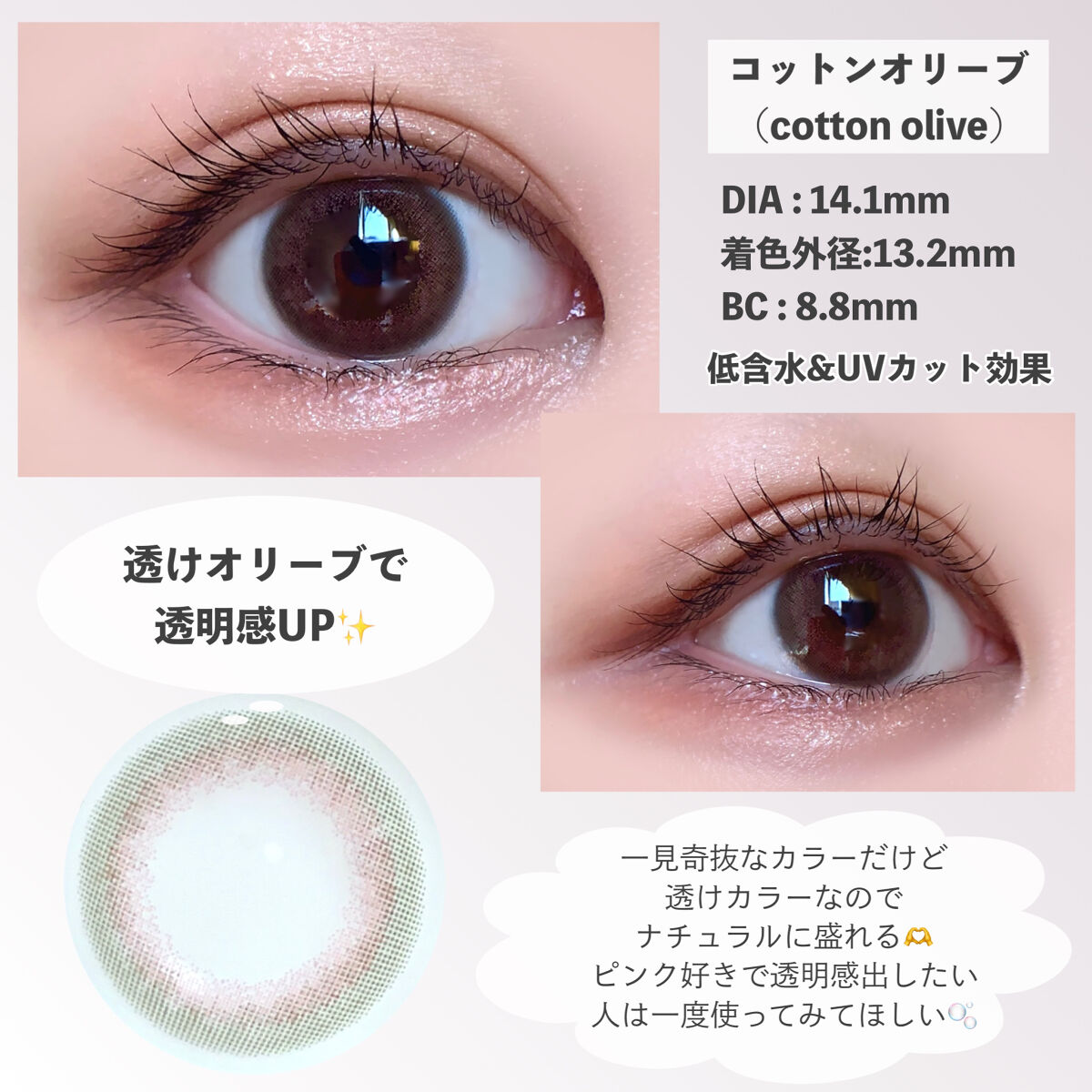KuMiaコットンオリーブ半額クーポンで購入✨度数は0.5きざみハイドロゲル素材🫧裸眼よりフチの色素が薄くなって儚い雰囲気になれる裸眼風コンタクト淡い発色のオリーブにピンクのハイライトハイライトはなじんであんまりわかりません😌裸眼より色素が薄...
