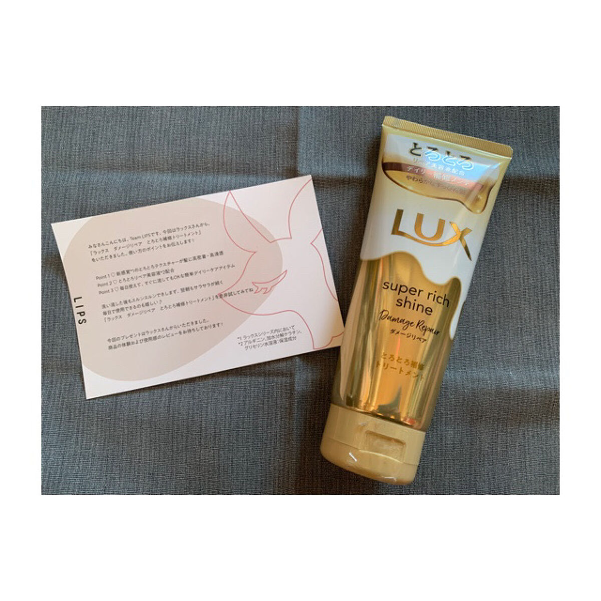ラックス スーパーリッチシャイン ダメージリペア 補修チューブトリートメントをお試しさせていただきました。嬉しい大容量タイプ。たっぷり使っています♪しっとりしたリッチなテクスチャーで、なめらかに毛先までなじんでくれます。ジューシーなみずみずし...