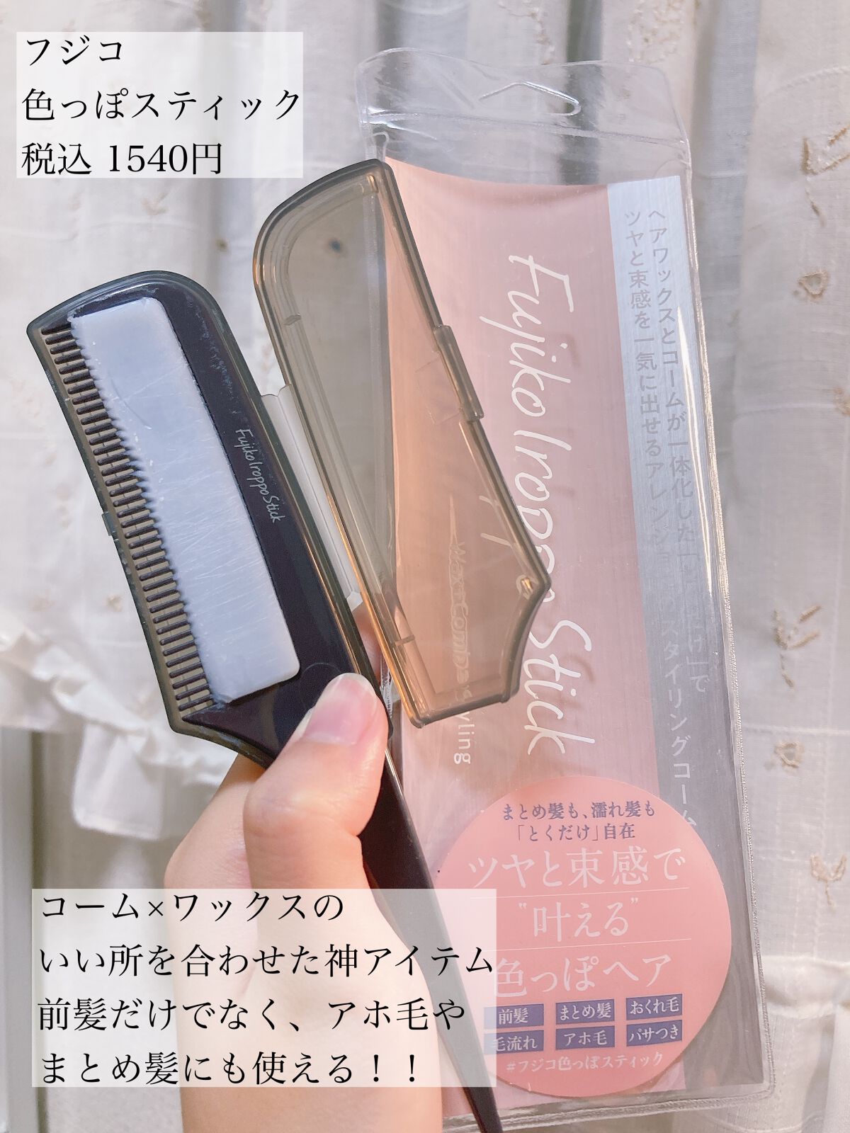- \仕上がり色っぽ/ ≪ツヤも束感も“とくだけ”自在≫ フジコ「色っぽスティック」がリニューアル!! ~ツヤと束感で叶える色っぽヘア~ ヘアワックスとコームが一体化。 「とくだけ」でツヤと束感を一気に出せるアレンジ自在のスタイリングコーム。 ◆リニューアルpoint! 髪のことを考えた4種の植物オイル「コメヌカオイル・アボカドオイル・オリーブオイル・ココナッツオイル」を新たに配合。(全て保湿成分) また、コームに”Fujiko”のロゴを追加♥ ≪前髪・まとめ髪・おくれ毛・毛流れ・アホ毛・パサつき...≫ とくだけ簡単、おしゃれに色っぽく。 ●手を汚さずスタイリングがキマる ●思い通りの前髪に ●アホ毛をピタッと黙らせて ●ツヤと束感でセクシーな毛流れに ●おくれ毛やまとめ髪がおしゃれに