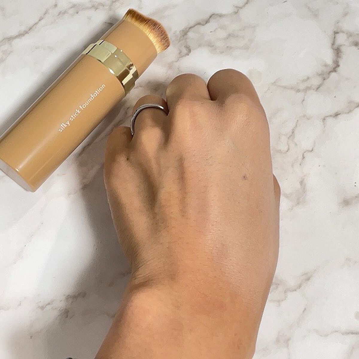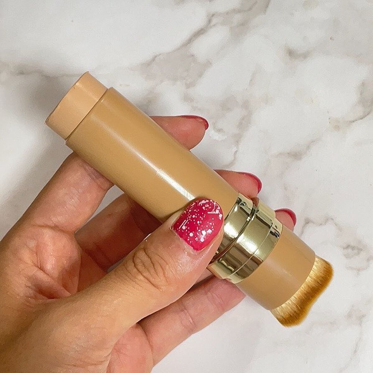 これ一本でベースメイクが完成するスティックファンデーション。ダブルエンドでファンデとブラシが一体になってるの。 ブラシは毛がびっしり!!その量なんと7万本しかもブラシの形がかわっていて、顔の骨格にあわせてカーブ型にカットされてるの。 ファンデはピタッと密着してくるし、ツヤがあるように見えるの✨保湿成分のルリジサエキスなども入っていて嬉しい♡♡♡