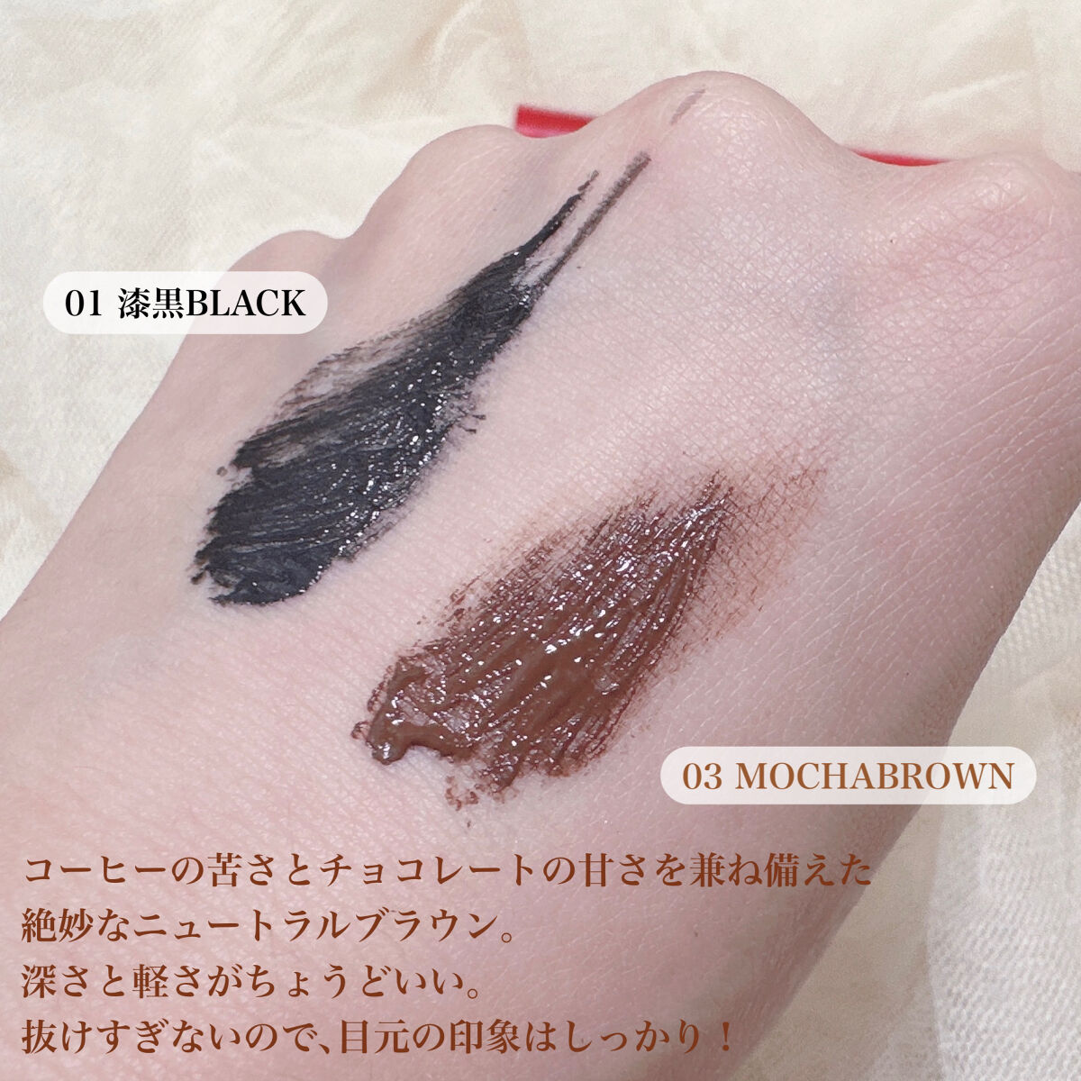 - <01 ブラック> 水、アクリレーツコポリマー、ミツロウ、カオリン、マイカ、PG、シリカ、ステアリン酸、ベヘン酸、ステアロイルグルタミン酸Na、ステアリルアルコール、ベヘニルアルコール、ポリビニルアルコール、オタネニンジン根エキス、ヘキサ(ヒドロキシステアリン酸/ステアリン酸/ロジン酸)ジペンタエリスリチル、モモ葉エキス、リンゴ果実エキス、ローズマリーエキス、AMP、BG、PEG-40水添ヒマシ油、エタノール、オレイン酸ポリグリセリル-10、シメチコン、ステアリン酸グリセリル、ステアリン酸ソルビタン、セルロースガム、ヒドロキシエチルセルロース、ヒドロキシプロピルシクロデキストリン、ヘクトライト、ポリアクリル酸Na、ポリイミド-1、ポリソルベート60、ラウレス-21、EDTA-2Na、デヒドロ酢酸Na、ブチルカルバミン酸ヨウ化プロピニル、メチルパラベン、酸化鉄、カーボンブラック <03 モカブラウン> 水、アクリレーツコポリマーアンモニウム、コメヌカロウ、PG、ヒマワリ種子ロウ、ステアリルアルコール、ベヘニルアルコール、ステアリン酸グリセリル、イソステアリン酸ポリグリセリル-2、ステアリン酸、ヘキサ(ヒドロキシステアリン酸/ステアリン酸/ロジン酸)ジペンタエリスリチル、オタネニンジン根エキス、モモ葉エキス、リンゴ果実エキス、ローズマリーエキス、(ビニルジメチコン/メチコンシルセスキオキサン)クロスポリマー、BG、PEG-40水添ヒマシ油、TEA、イソステアリルアルコール、イソステアリン酸PEG-20グリセリル、イソステアリン酸ソルビタン、エタノール、オレイン酸ポリグリセリル-10、シメチコン、シリカ、ステアリン酸ソルビタン、ステアロイルグルタミン酸Na、セルロースガム、ヒドロキシプロピルシクロデキストリン、ベヘン酸、ポリアクリル酸Na、ポリソルベート60、ポリメチルシルセスキオキサン、ミリスチン酸ポリグリセリル-10、ラウレス-21、EDTA-2Na、デヒドロ酢酸Na、ブチルカルバミン酸ヨウ化プロピニル、メチルパラベン、酸化鉄、カーボンブラック