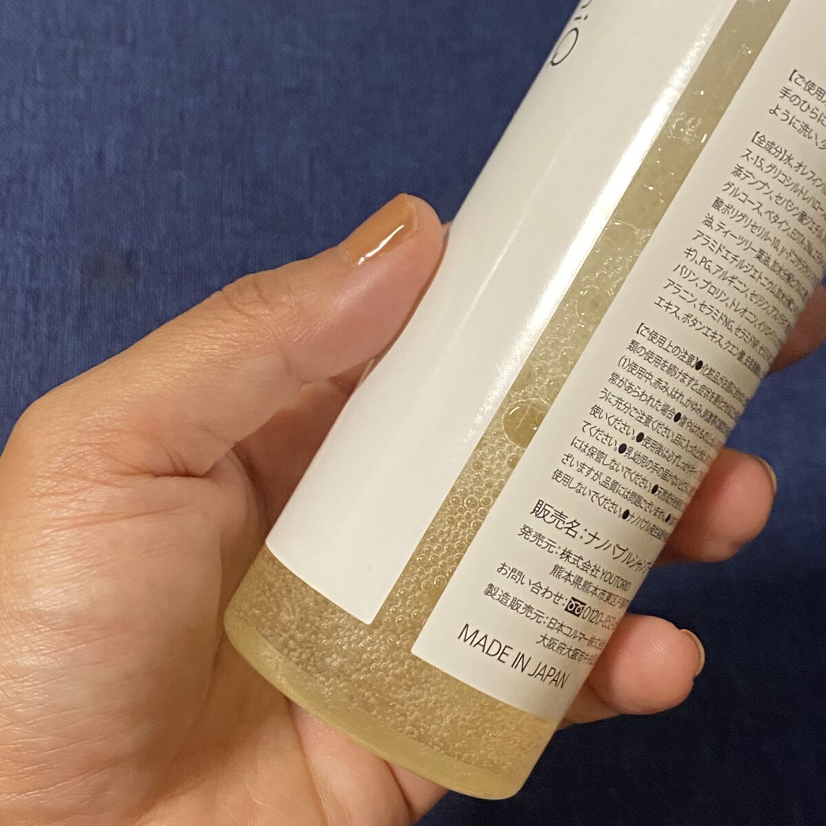 - 水、オレフィン(C14-16)スルホン酸Na、ラウロイルメチルアラニンNa、ラウラミドプロピルベタイン、オレス-15、グリコシルトレハロース、BG、コカミドメチルMEA、PCAイソステアリン酸PEG-40水添ヒマシ油、加水分解水添デンプン、セバシン酸ジエチル、ポリクオタニウム-10、ココイルグルタミン酸TEA、ジオレイン酸PEG-120メチルグルコース、ベタイン、EDTA-2Na、エチルヘキシルグリセリン、ポリクオタニウム-47、ポリクオタニウム-7、ラウリン酸ポリグリセリル-10、γ-ドコサラクトン、マカデミア種子油、アルガニアスピノサ核油、ツバキ種子油、ホホバ種子油、ティーツリー葉油、加水分解ヒアルロン酸、シクロヘキサン-1,4-ジカルボン酸ビスエトキシジグリコール、セテアラミドエチルジエトニウム加水分解コメタンパク、グリセリン、PCA-Na、乳酸Na、加水分解ケラチン(カシミヤヤギ)、PG、アルギニン、セリシン、アスパラギン酸、PCA、グリシン、アラニン、セリン、ジステアリルジモニウムクロリド、バリン、プロリン、トレオニン、イソロイシン、クオタニウム-33(羊毛)、コレステロール(羊毛)、ヒスチジン、フェニルアラニン、セラミドNG、セラミドNP、セラミドAP、ユズ果実エキス、ビワ葉エキス、カミツレ花エキス、ソメイヨシノ葉エキス、ボタンエキス、クエン酸、安息香酸Na、バニリルブチル、クエン酸Na、塩化Na、香料、フェノキシタノール