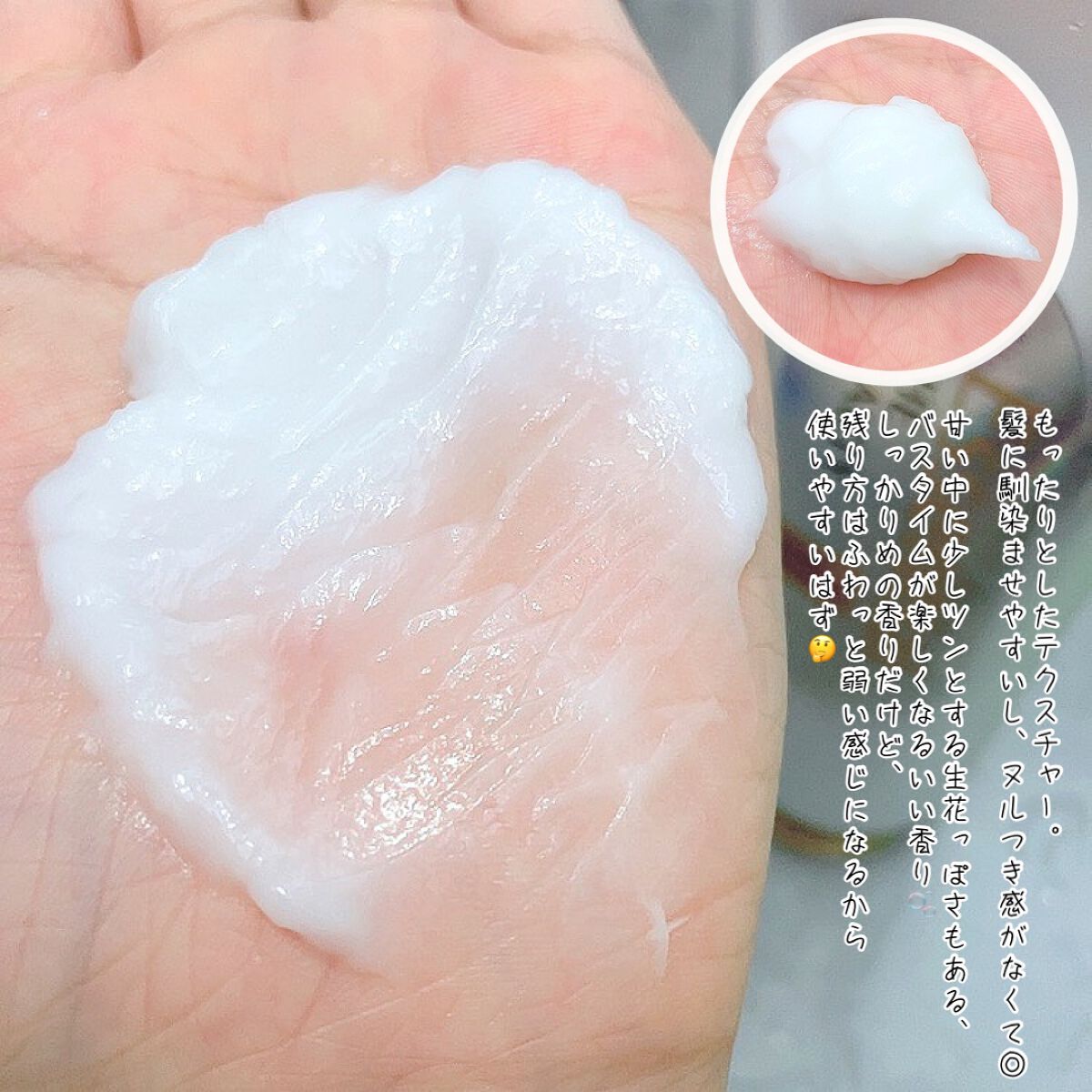 黄色のもったり濃厚なクリームテクスチャーで、髪に馴染みやすい😊 ふんわりホワイトフローラルブーケの香り💐 ピーチとピオニーのやさしい香りにレモンの爽やかな清潔感をプラスしてるそう。 洗い流しもしやすく、するんと質感でぬめりも感じにくいのが◎ しっとりサラッとした指通りのいい使用感で、重すぎず軽すぎずなのが私好み👍