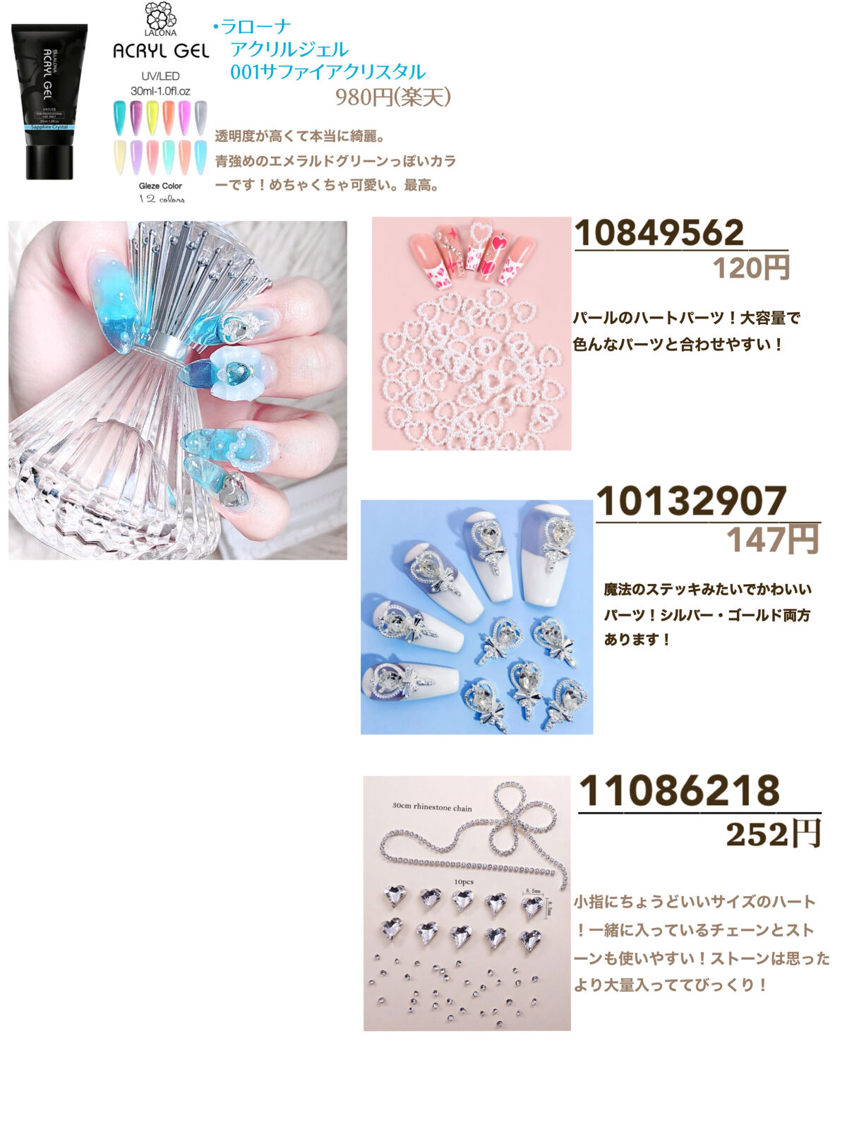 | ネイルランキング第122位 | これはほんとに綺麗なパーツです! 量もしっかり入ってるし、コスパ最高! | 詳細を見る | |
