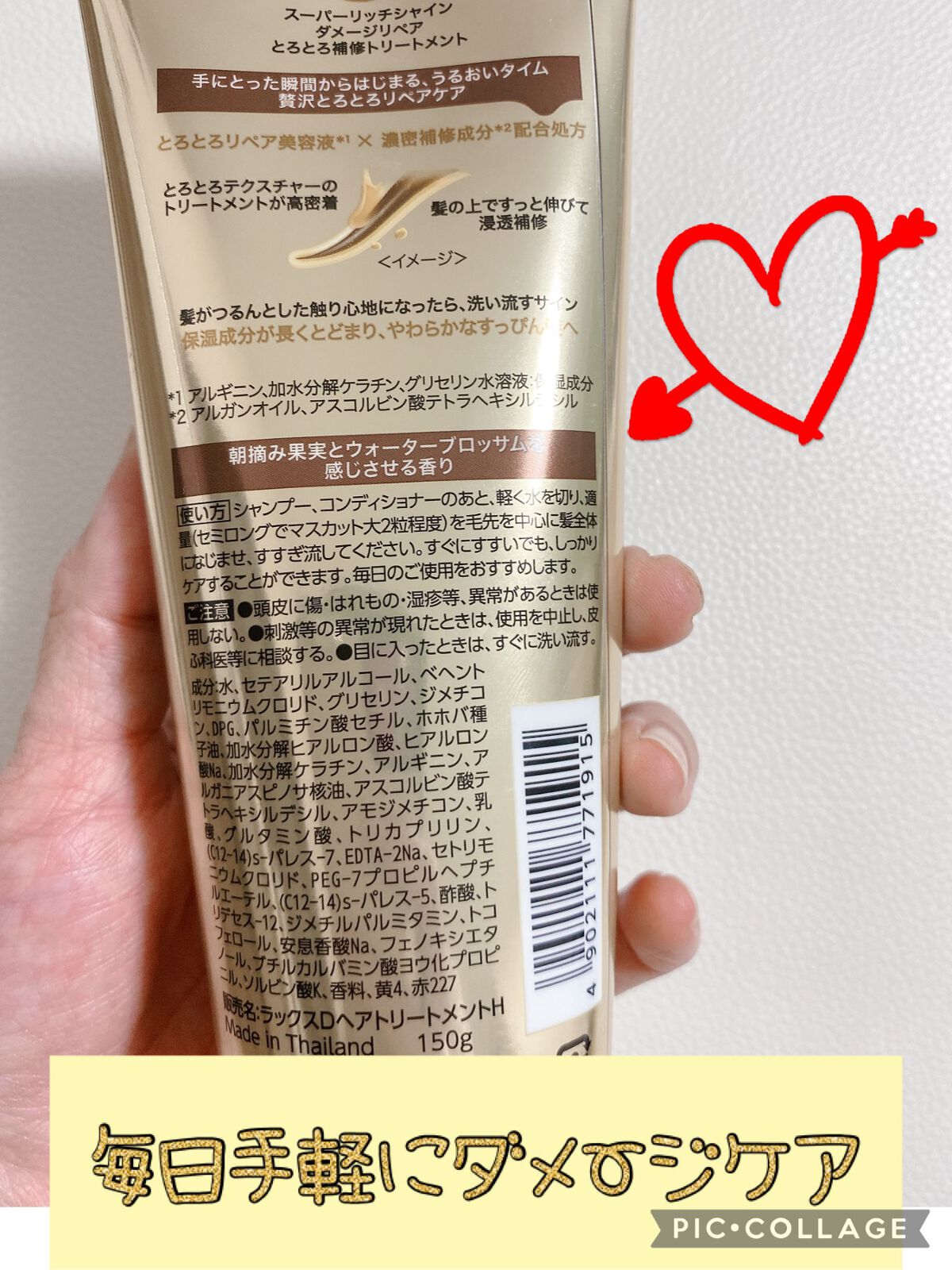 - <150g> 水、セテアリルアルコール、ベヘントリモニウムクロリド、グリセリン、ジメチコン、DPG、パルミチン酸セチル、ホホバ種子油、加水分解ヒアルロン酸、ヒアルロン酸Na、加水分解ケラチン、アルギニン、アルガニアスピノサ核油、アスコルビン酸テトラヘキシルデシル、アモジメチコン、乳酸、グルタミン酸、トリカプリリン、(C12-14)s-パレス-7、EDTA-2Na、セトリモニウムクロリド、PEG-7プロピルヘプチルエーテル、(C12-14)s-パレス-5、酢酸、トリデセス-12、ジメチルパルミタミン、トコフェロール、安息香酸Na、フェノキシエタノール、ブチルカルバミン酸ヨウ化プロピニル、ソルビン酸K、香料、黄4、赤227 <300g> 水、セテアリルアルコール、ベヘントリモニウムクロリド、グリセリン、ジメチコン、DPG、パルミチン酸セチル、ホホバ種子油、加水分解ヒアルロン酸、ヒアルロン酸Na、加水分解ケラチン、アルギニン、アルガニアスピノサ核油、アスコルビン酸テトラヘキシルデシル、アモジメチコン、乳酸、グルタミン酸、トリカプリリン、(C12-14)s-パレス-7、EDTA-2Na、セトリモニウムクロリド、PEG-7プロピルヘプチルエーテル、(C12-14)s-パレス-5、酢酸、トリデセス-12、ジメチルパルミタミン、トコフェロール、安息香酸Na、フェノキシエタノール、ブチルカルバミン酸ヨウ化プロピニル、ソルビン酸K、香料、黄4、赤227