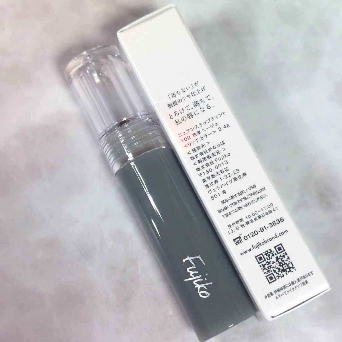 Fujiko(フジコ)のニュアンスラップティント初のラメ入り限定カラー グレープフルーツの香りが結構気に入っていて、以前から愛用してたティントなので見つけて早速GET キラキラのラメ入りで透け感のある大人のプラムカラー 色持ちが良いティントタイプなのに付けたてのツヤ感とぷっくり感もしっかりキープ! 唇表面を包み込むうるおいヴェールが縦ジワをカバーして、ぷっくりつややかな質感