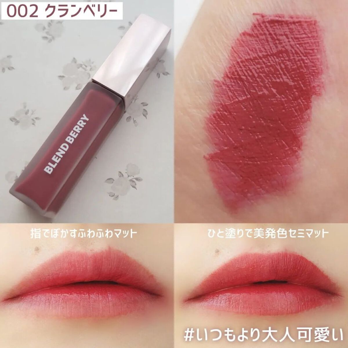 【ムース仕立ての深みクランベリーリップ♡】BLENDBERRYムースタッチティントリップ002クランベリー参考価格1,650円(税込)秋冬にあわせたくって濃厚なベリー色を買ってみた♪”セミ”マットな質感で高発色かつ乾燥しにくくしているんだって...
