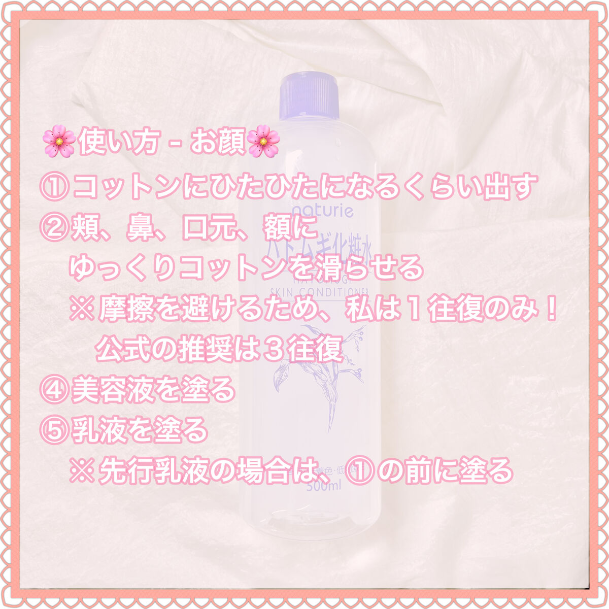 - 肌にうるおいを与えてスキンコンディションを整える、天然保湿成分ハトムギエキス配合の化粧水です。 みずみずしく浸透力に優れた処方なので、重ねるほどぐんぐん肌になじみ、角質層を水分で満たします。 たっぷり肌に重ねづけしてもべたつかないさっぱりした使用感なので、スキンケアのはじめにたっぷり使ってください。 肌がひんやりしてきたら十分に水分がなじんだサインです。 ■基本は化粧水として スキンケアのはじめにたっぷり使ってください。 500円玉大の量を3回重ねづけするのが目安です。 肌がひんやりしてきたら十分に水分がなじんだサインです。 ■ローションパックでさらにうるおい コットンやフェイスマスクにたっぷり含ませて約3分間パックすると、角質水分量がさらに高まります。 ■プレ化粧水として 洗顔後すぐにつけることで、その後につけるスキンケアのなじみをよくします。※角質層まで ■ボディにも べたつかないので、毎日の入浴後や日差しを浴びた後などのボディのスキンケアにもおすすめです。