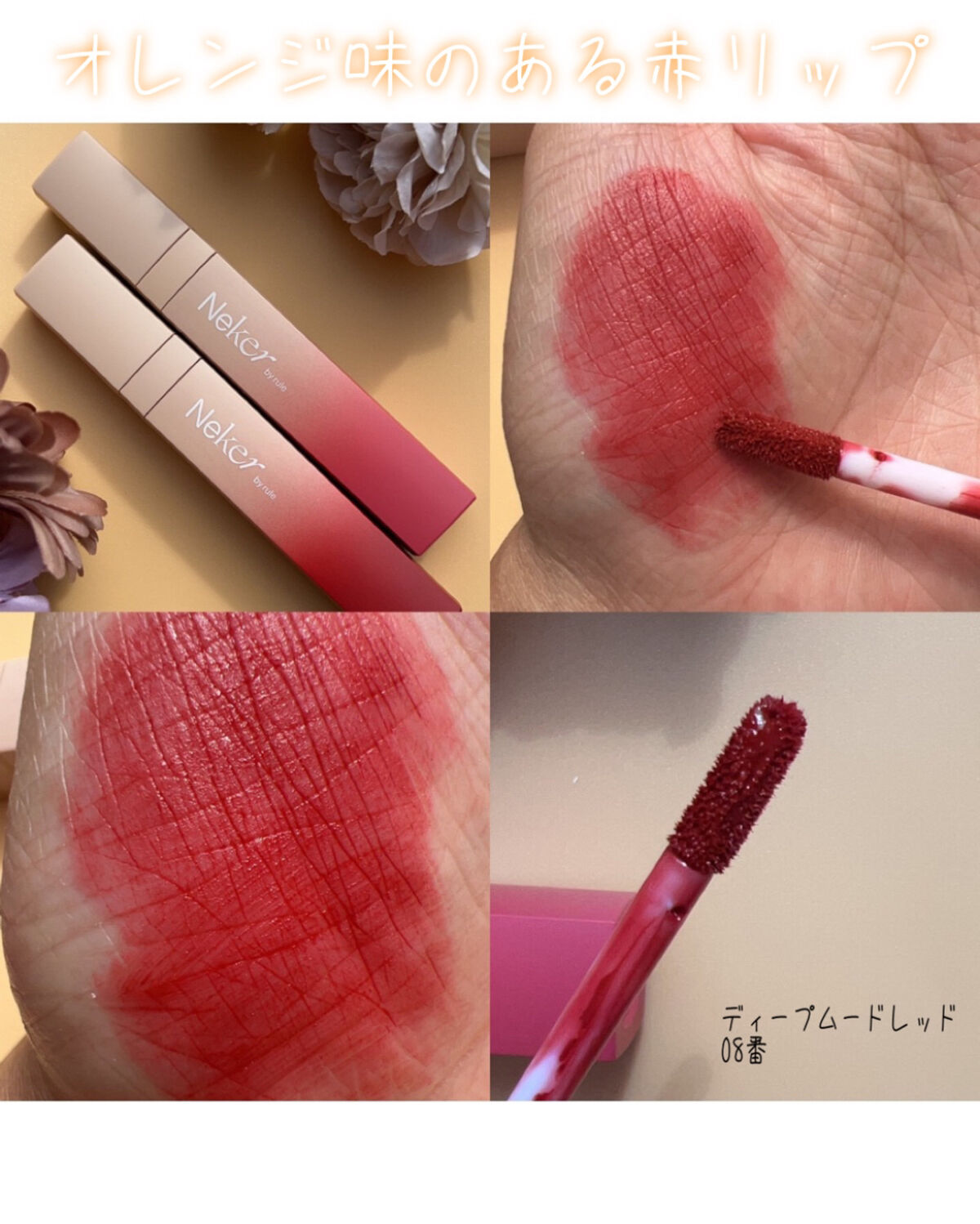 発色も良く、ほんのりツヤ感がたまらなく可愛い💓 色落ちも少なく 時短がを落ちてからティッシュオフすると 色も残ってるしマスクにもつきにくい🙆♀️🤍 マットよりもどちらかというと ほんのりツヤって感じの印象!! 香りは甘い香りで 乾燥する感じもありませんてました✨ 手につけると ガッツリブラウンって感じのカラー💄 お気に入りコスメでした💓