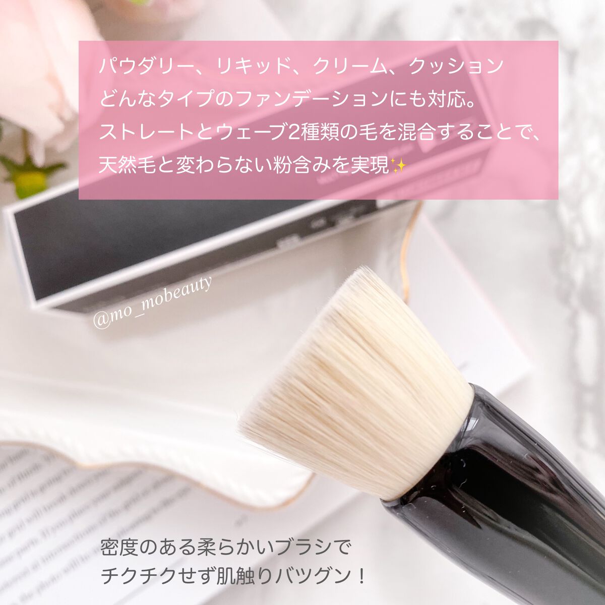 - パウダリー、リキッド、クリーム、クッションどんなタイプのファンデーションにも対応。 毛量はもちろん、長さもミリ単位で追求したブラシはオール人工毛でありながら、まるで山羊毛のように柔らか。 ストレートとウェーブ、2種類の毛を混合することで、天然毛と変わらない粉含みを実現しました。 しっかりとしたコシを兼ね備えているので、肌の上をサッとすべらすだけで、誰でも失敗することなくなめらかな美肌に。 また、リキッドファンデーションに使用すれば、肌にムラなく高密着し、簡単にツヤ肌が完成します。