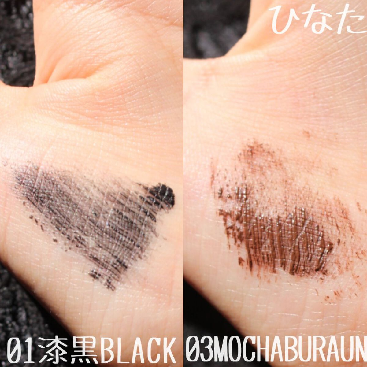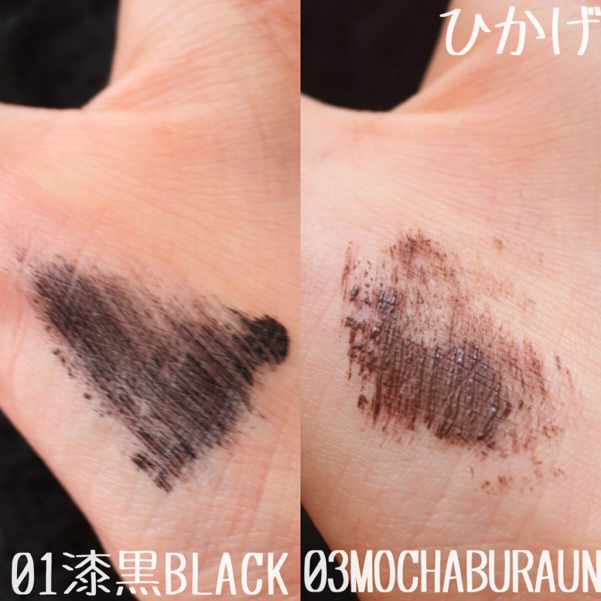 - <01 ブラック> 水、アクリレーツコポリマー、ミツロウ、カオリン、マイカ、PG、シリカ、ステアリン酸、ベヘン酸、ステアロイルグルタミン酸Na、ステアリルアルコール、ベヘニルアルコール、ポリビニルアルコール、オタネニンジン根エキス、ヘキサ(ヒドロキシステアリン酸/ステアリン酸/ロジン酸)ジペンタエリスリチル、モモ葉エキス、リンゴ果実エキス、ローズマリーエキス、AMP、BG、PEG-40水添ヒマシ油、エタノール、オレイン酸ポリグリセリル-10、シメチコン、ステアリン酸グリセリル、ステアリン酸ソルビタン、セルロースガム、ヒドロキシエチルセルロース、ヒドロキシプロピルシクロデキストリン、ヘクトライト、ポリアクリル酸Na、ポリイミド-1、ポリソルベート60、ラウレス-21、EDTA-2Na、デヒドロ酢酸Na、ブチルカルバミン酸ヨウ化プロピニル、メチルパラベン、酸化鉄、カーボンブラック <03 モカブラウン> 水、アクリレーツコポリマーアンモニウム、コメヌカロウ、PG、ヒマワリ種子ロウ、ステアリルアルコール、ベヘニルアルコール、ステアリン酸グリセリル、イソステアリン酸ポリグリセリル-2、ステアリン酸、ヘキサ(ヒドロキシステアリン酸/ステアリン酸/ロジン酸)ジペンタエリスリチル、オタネニンジン根エキス、モモ葉エキス、リンゴ果実エキス、ローズマリーエキス、(ビニルジメチコン/メチコンシルセスキオキサン)クロスポリマー、BG、PEG-40水添ヒマシ油、TEA、イソステアリルアルコール、イソステアリン酸PEG-20グリセリル、イソステアリン酸ソルビタン、エタノール、オレイン酸ポリグリセリル-10、シメチコン、シリカ、ステアリン酸ソルビタン、ステアロイルグルタミン酸Na、セルロースガム、ヒドロキシプロピルシクロデキストリン、ベヘン酸、ポリアクリル酸Na、ポリソルベート60、ポリメチルシルセスキオキサン、ミリスチン酸ポリグリセリル-10、ラウレス-21、EDTA-2Na、デヒドロ酢酸Na、ブチルカルバミン酸ヨウ化プロピニル、メチルパラベン、酸化鉄、カーボンブラック