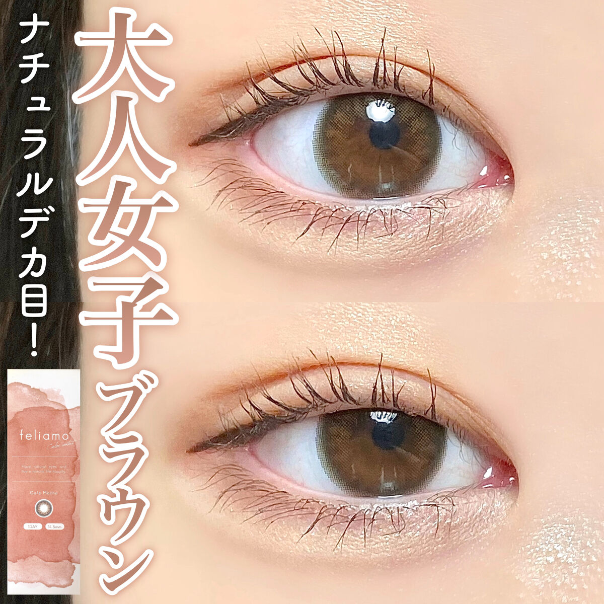 - ※2025年6月以降、商品パッケージ裏面・側面の一部表記を順次変更いたします。尚、これにかかる商品の交換・返品は承っておりません。 どんな瞬間にも溶け込む誰からも愛される瞳へ feliamoの由来は felice amore~幸せな愛~ 瞳から愛されオーラを放つ好印象レンズで女性らしさと品を演出。 オンも、オフも、特別な日も。 どんな場面にも溶け込むレンズラインナップで誰からも愛される瞳に。 UV CUT Feature1 肌や瞳に有害といわれ、白内障などの眼病を引き起こす危険性のある紫外線を99%カットします。(UV-A波75%、UV-B波99%カット) イオン性 Feature1 水分を多く含み酸素を通しやすいため瞳にやさしい使い心地で、快適な装用感です。 高含水 Feature1 水分が多く含むやわらかい素材で、快適なつけ心地です。 レンズ構造 Feature1 まぶた側に着色剤を内包しているため、角膜に色素が触れることがない構造を採用しています。 レンズ形状 Feature1 フチを丸みのある形状にすることで自然な装用感を実現しました。 ※装用感には個人差があります。 カラーコンタクトレンズの不適正使用による眼障害の危険性等などがあります。 ●コンタクトレンズは高度管理医療機器です。不十分な洗浄・消毒など不適切なケアや、長時間・交換期間を超えた装用により、アレルギー性結膜炎、角膜感染症、角膜潰瘍等の重篤な眼障害が発生する危険性があります ●ご使用前に取扱説明書を確認してください 使用上の留意事項 ●眼科医院等を受診してからお求めください ●眼に異常を感じたら直ちにレンズ使用を中止し、お近くの眼科等で診察を受けてください ●医師の指示にしたがってご使用ください ●コンタクトレンズを装用する場合、自覚症状がなくても、眼科医院等での定期検査を受けてください ●レンズに不具合がある場合は使用しないでください