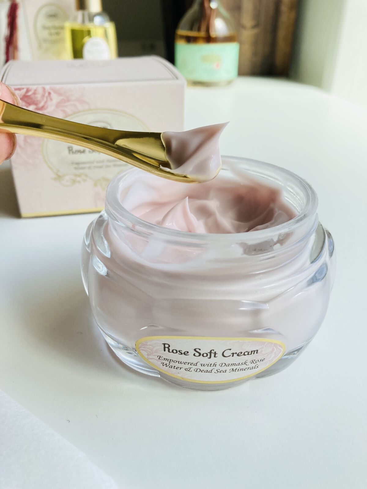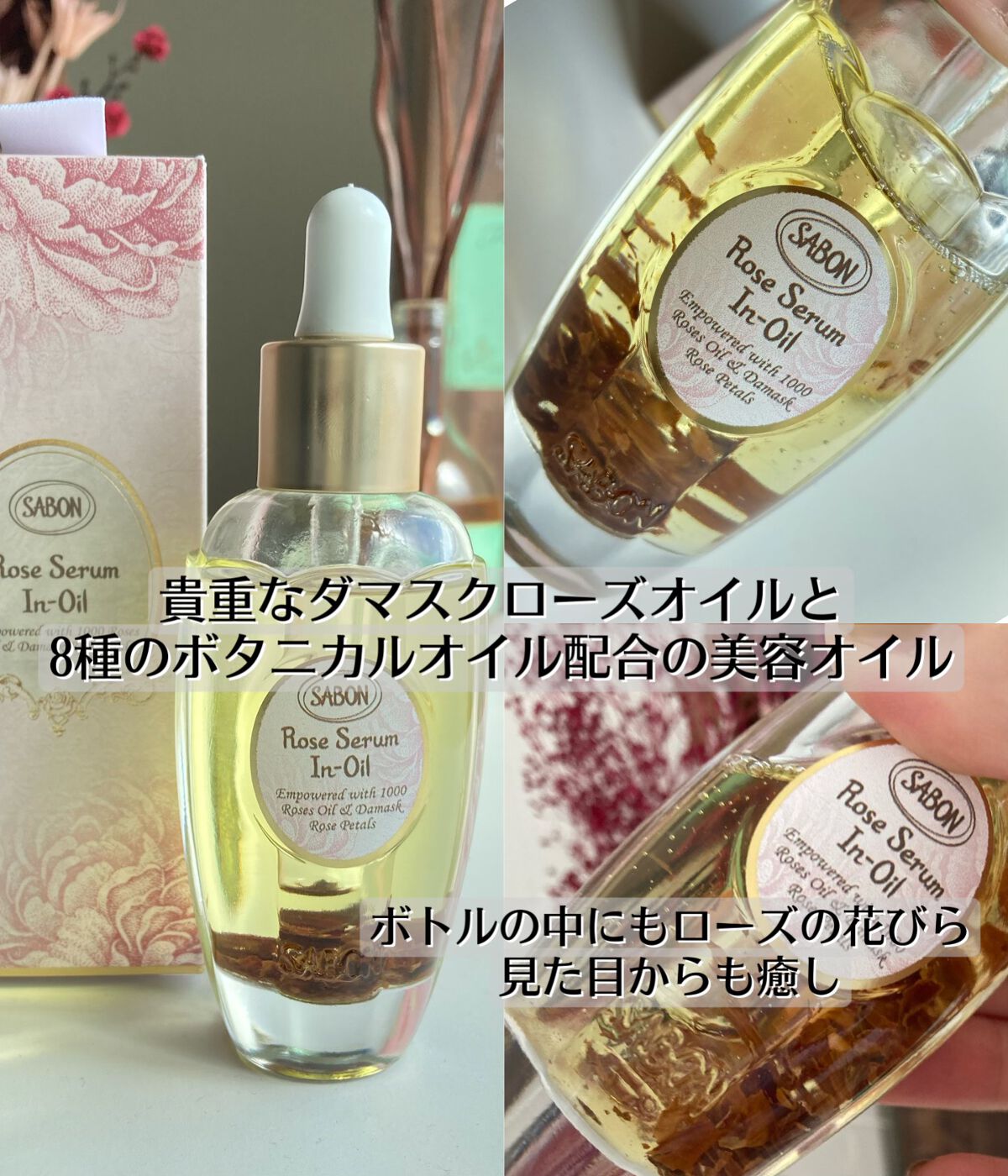 シルクのような輝きのオーラをまとう凝縮美容オイル。〝ローズの生命力〟が宿り、光を放ちいきいきと輝く肌に。 オイルに花びらがしっかり入っていて、一緒に花びらが出てこないか心配ですが、花びらのかけらがちょこちょこ出てきて気になりましたが、見かけより出てこないです🙇♀️ クリーム自体は、とても柔らかいテクスチャーで伸びも良いです。ローズのオイルとの相性は良いのですが、他のオイル美容液と合わせると、分離するような感じになりました🥲