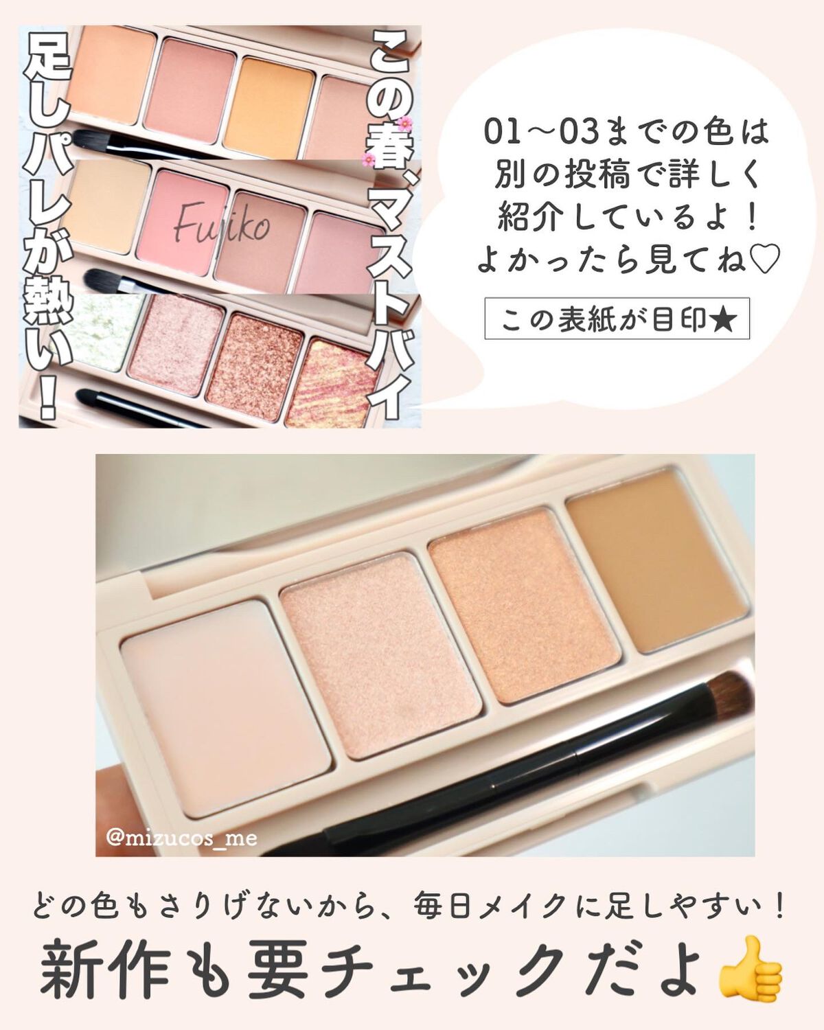 使える色だけ集めたという4色のアイカラーパレット 単色でも、この4色パレットのみでも、他の手持ちアイシャドーと組み合わせても良い便利な設計になっています♪ 発色は、パレット見たままの色が出て高発色 01番は暖色系4色オールマットタイプですが、ふわっとなめらか透明感があり、ナチュラル感を出しつつ引き締まると思います この足しパレシリーズ他にもラメが足せる03、ハイライトとローライトパレットの04、抜け感アイブロウ05(これは私持っていて便利で愛用中)と色々な種類があって、楽しい😆し便利👍🏻✨