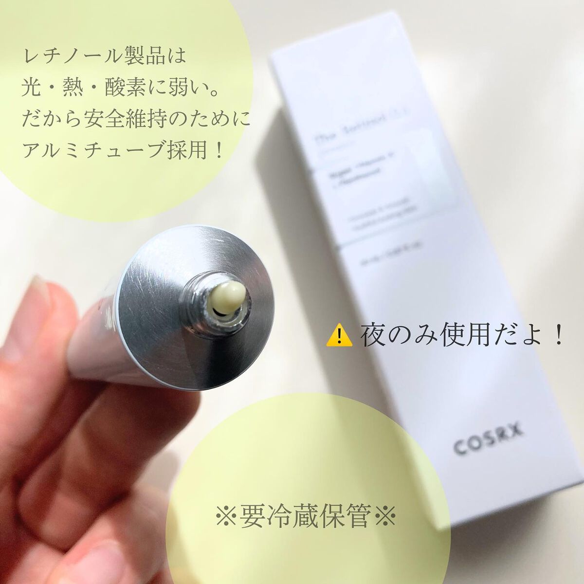 - #初心者向けのレチノール #初めてのレチノール ◎純粋レチノール0.1%安定化処方(保湿成分として) ◎お家で本格的な皮膚科学に基づいた保湿ケアが可能 ◎乾燥による毛穴目立ち/弾力/ハリにこだわりの保湿効果 ・「ノンコメドジェニックテスト(*1)」済み ・「敏感肌対象一次刺激テスト(*1)」済み ・「皮膚一次刺激テスト(*1)」済み 【こんな方におすすめ】 ・乾燥により目立った毛穴がお悩みの方 ・早めにエイジングケア(*2)を始めたい方 ・特に20代におすすめ ・時間が経つとメイクが浮き出る方 【注意事項】 ・アルミチューブの特性上初回オープン時に飛び出す可能性がございますのでご注意ください。 ・品質維持のため冷蔵保存おすすめ *1 )全ての方にコメド(ニキビのもと)や刺激が発生しないということではありません。 *2 )年齢を重ねた肌にうるおいを与えること
