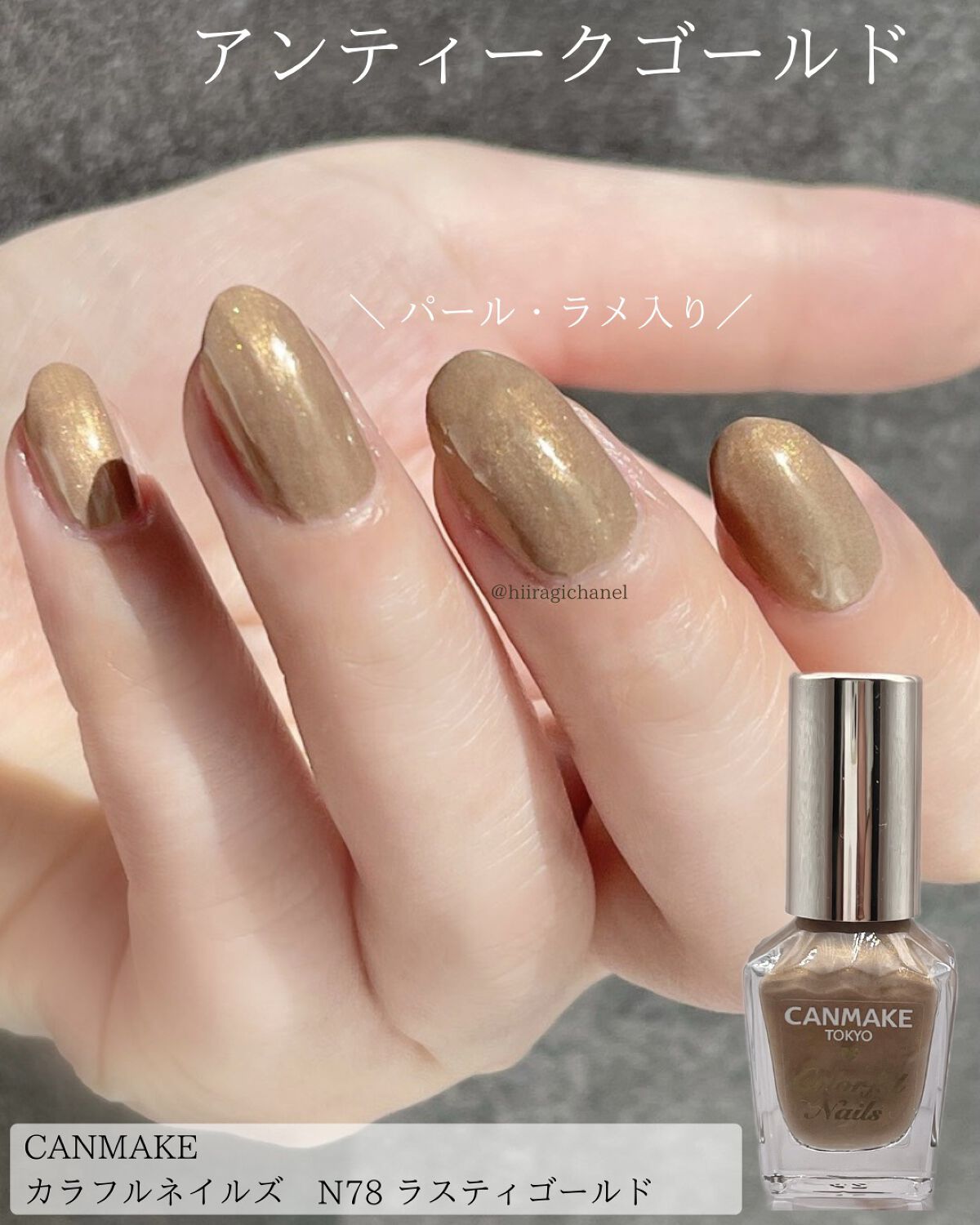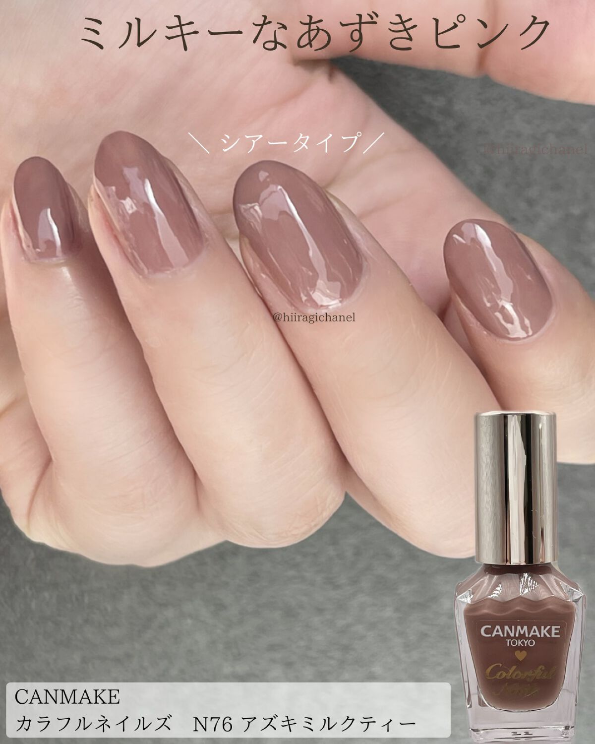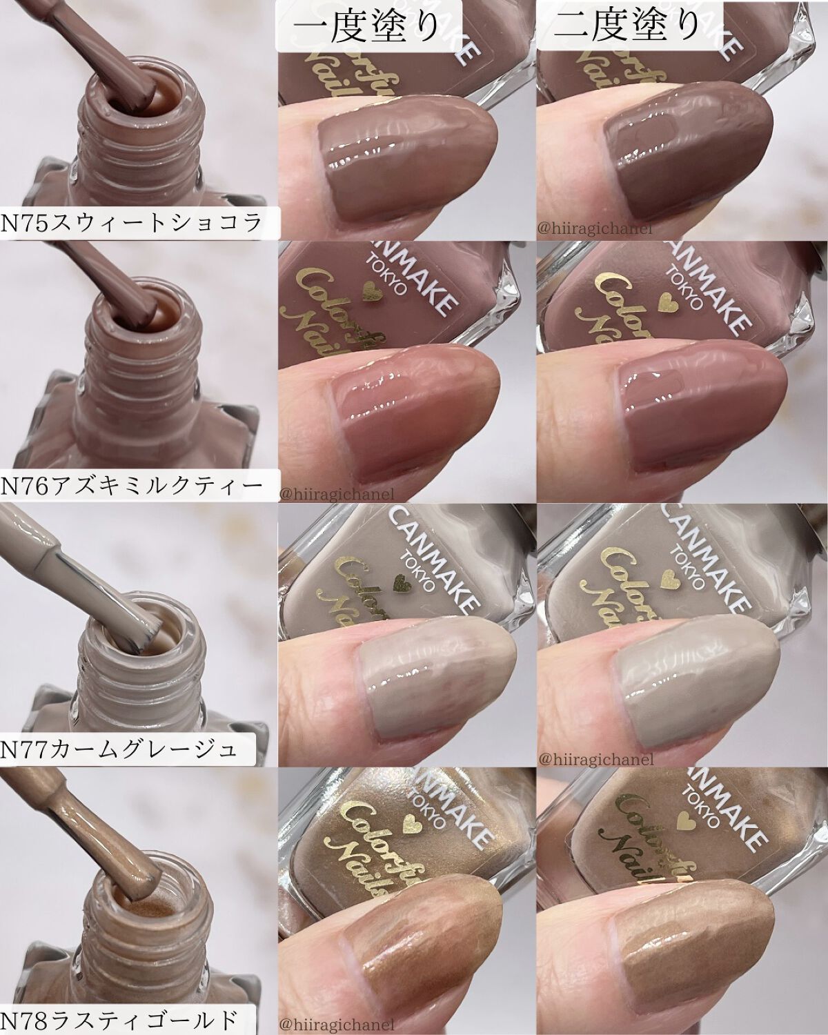 キャンメイクのカラフルネイルズからカフェをイメージしたヌーディーな限定4色が新登場〜☕️✨ 税込396円といつも驚いてしまう、キャンメイクの企業努力で叶えられているコスパ◎なネイルポリッシュ。 塗りやすさにこだわった持ちやすいキャップに液含みが良く、コシのある平筆ハケが扇形に広がり、ムラなくキレイに塗ることが出来ます。 速乾タイプ且つ仕上がりがツヤツヤでネイルする時間を楽しませてくれますよ🕊🌿 N75 スウィートショコラ…赤みのあるブラウン N76 アズキミルクティー…色味調整が出来るシアータイプで、ミルキーなあずきピンク N77 カームグレージュ…白ニットに合わせたら可愛い!ニュートラルなグレージュ。 N78 ラスティゴールド…錆びたアンティーク品のようなゴールド