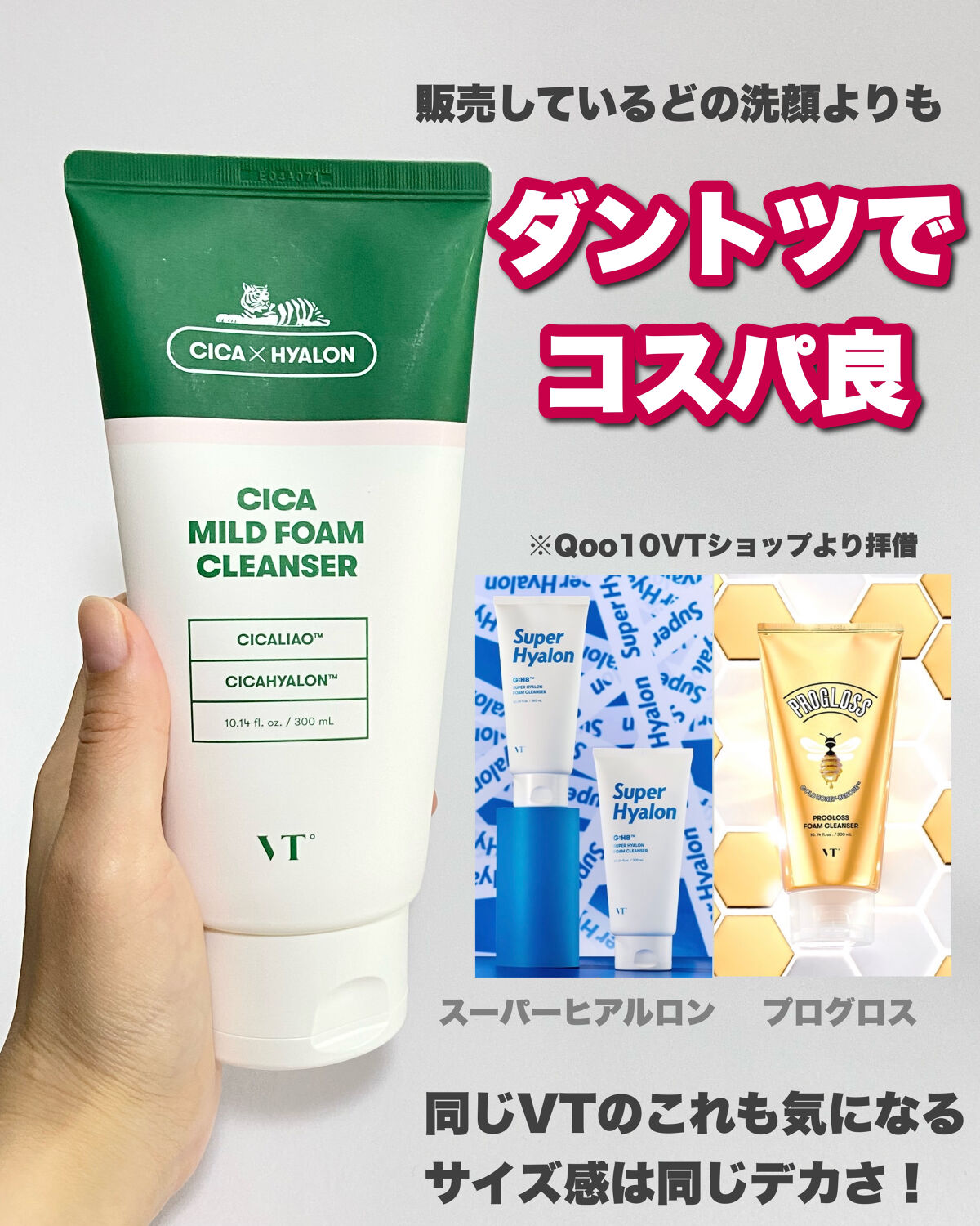 - VT シカフォームクレンザー (VT CICA MILD FOAM CLEANSER) 毛穴に溜まった汚れを吸着してクリアな美肌に導く、大容量!シカ・マイルド・フォームクレンザー。 柔らかいもちもち泡で、汚れや皮脂をしっかり除去! 6種のハーブ成分*を配合で、敏感肌のことを考えた洗顔フォーム。洗顔後のつっぱり感もなくすこやかに保ちます。 VT独自の整肌成分シカリオ™**を配合しており、肌の乾燥を防ぎ、水分バリア機能をサポートします。 水分供給・肌整肌成分と3重ヒアルロン酸で、肌に豊かな水分をたっぷりチャージし、うるおい美肌に導いてくれます◎ もちろん洗浄力も!日焼け止めやベースメイクまでしっかりさっぱり洗いあがるのに、しっとりとした使い心地です。 *ラベンダーエキス、タイマツバナ葉エキス、セイヨウハッカ葉エキス、フリージアエキス、カミツレ葉エキス、ローズマリー葉エキス:(すべて整肌成分) **ツボクサエキス、センテラ4Xコンプレックス(アシアチン酸、マデカッソシド、マデカシン酸、アシアチコシド):(すべて整肌成分)