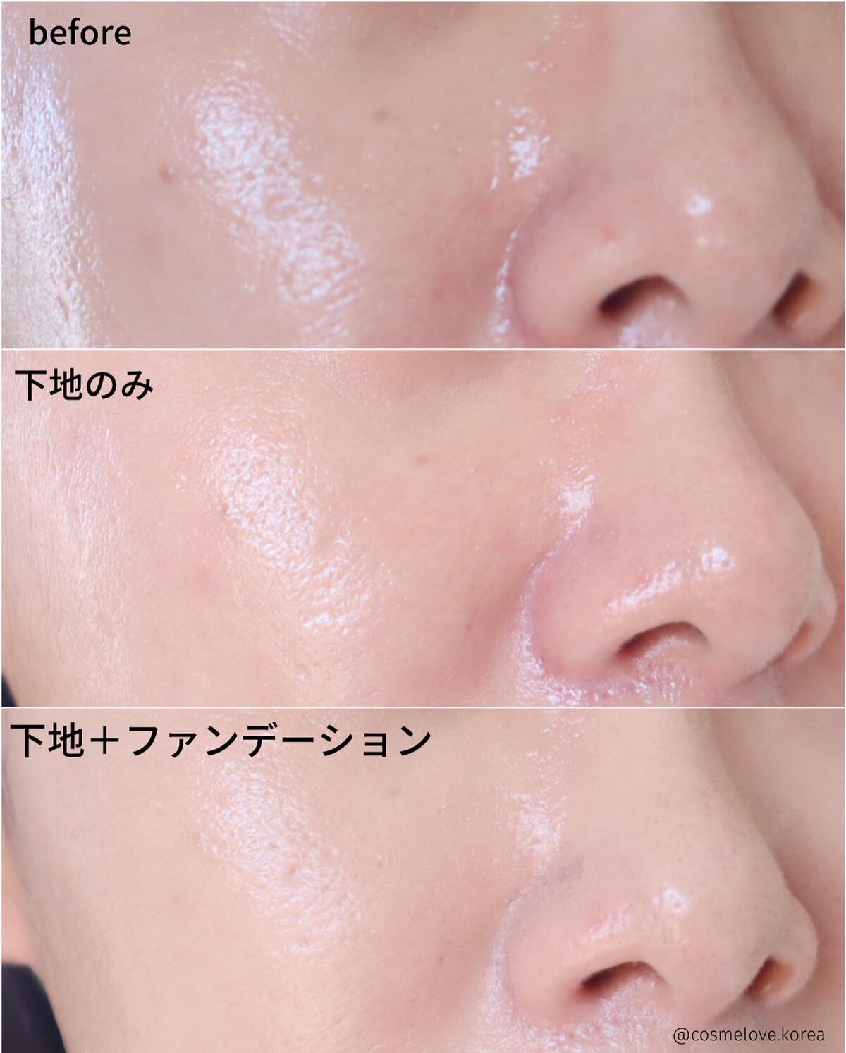 見て下さい。この濡れツヤ感。めちゃくちゃ可愛くないですか? しかもスキンケア成分を80%以上配合したジェルが肌にピタッと密着し、長時間うるおいとツヤをキープし、油分を抑えた伸びの良いテクスチャーでヨレや乾燥にも強く、夏でも崩れ知らずのアイテムです。 粉飛びすることもないので、パウダータイプでは実現できないまるで肌本来の輝きのようなナチュラルなツヤ感を演出してくれます。