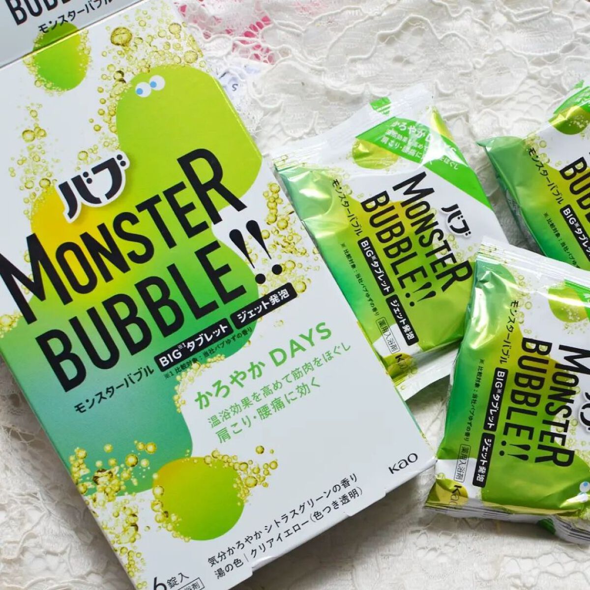 温浴効果を高めて筋肉をほぐし 肩こり・腰痛に効く かろやかDAYS 気分かろやかシトラスグリーンの香り。 シトラスグリーンの爽やかな香りもとても良かったです。全体的な使用感から、「かろやかDAYS」というネーミングは本当にこの商品にピッタリだなと思いました💗 990円で6錠入りなので、同じ値段で4個入りのモンスターバブルMEGA級と比較すると少しお安め。
