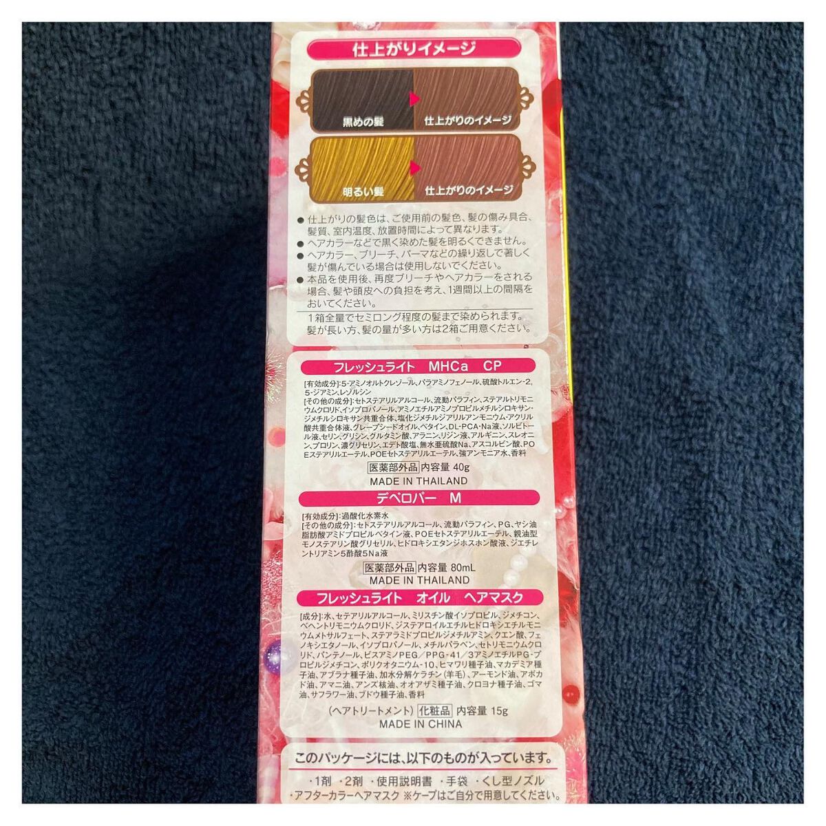 - <ロイヤルブラウン> フレッシュライト MHCa ROBR[有効成分]:塩酸2,4‐ジアミノフェノキシエタノール、パラアミノフェノール、メタアミノフェノール、硫酸トルエン‐2,5‐ジアミン、レゾルシン [その他の成分]:セトステアリルアルコール、流動パラフィン、ステアルトリモニウムクロリド、イソプロパノール、アミノエチルアミノプロピルメチルシロキサン・ジメチルシロキサン共重合体、塩化ジメチルジアリルアンモニウム・アクリル酸共重合体液、グレープシードオイル、ベタイン、DL‐PCA・Na液、ソルビトール液、セリン、グリシン、グルタミン酸、アラニン、リジン液、アルギニン、スレオニン、プロリン、濃グリセリン、エデト酸塩、無水亜硫酸Na、アスコルビン酸、POEステアリルエーテル、POEセトステアリルエーテル、強アンモニア水、香料 デベロパー M[有効成分]:過酸化水素水 [その他の成分]:セトステアリルアルコール、流動パラフィン、PG、ヤシ油脂肪酸アミドプロピルベタイン液、POEセトステアリルエーテル、親油型モノステアリン酸グリセリル、ヒドロキシエタンジホスホン酸液、ジエチレントリアミン5酢酸5Na液 フレッシュライト オイル ヘアマスク 成分:水、セテアリルアルコール、ミリスチン酸イソプロピル、ジメチコン、ベヘントリモニウムクロリド、ジステアロイルエチルヒドロキシエチルモニウムメトサルフェート、ステアラミドプロピルジメチルアミン、クエン酸、フェノキシエタノール、イソプロパノール、メチルパラベン、セトリモニウムクロリド、パンテノール、ビスアミノPEG/PPG‐41/3アミノエチルPG‐プロピルジメチコン、ポリクオタニウム‐10、ヒマワリ種子油、マカデミア種子油、アブラナ種子油、加水分解ケラチン(羊毛)、アーモンド油、アボカド油、アマニ油、アンズ核油、オオアザミ種子油、クロヨナ種子油、ゴマ油、サフラワー油、ブドウ種子油、香料 <チャコールグレージュ> フレッシュライト MHCa CHG[有効成分]:塩酸2,4‐ジアミノフェノキシエタノール、パラアミノフェノール、硫酸トルエン‐2,5‐ジアミン、レゾルシン その他の成分:セトステアリルアルコール、流動パラフィン、ステアルトリモニウムクロリド、イソプロパノール、アミノエチルアミノプロピルメチルシロキサン・ジメチルシロキサン共重合体、塩化ジメチルジアリルアンモニウム・アクリル酸共重合体液、グレープシードオイル、ベタイン、DL‐PCA・Na液、ソルビトール液、セリン、グリシン、グルタミン酸、アラニン、リジン液、アルギニン、スレオニン、プロリン、濃グリセリン、エデト酸塩、無水亜硫酸Na、アスコルビン酸、POEステアリルエーテル、POEセトステアリルエーテル、強アンモニア水、香料 デベロッパー Ma[有効成分]:過酸化水素水 その他の成分:セトステアリルアルコール、流動パラフィン、PG、ヤシ油脂肪酸アミドプロピルベタイン液、フェノキシエタノール、POEセトステアリルエーテル、親油型モノステアリン酸グリセリル、ピロリン酸Na、ヒドロキシエタンジホスホン酸液 リペア ヘアトリートメント 成分:水、セテアリルアルコール、ミリスチン酸イソプロピル、ジメチコン、アモジメチコン、ベヘントリモニウムクロリド、ジステアロイルエチルヒドロキシエチルモニウムメトサルフェート、ステアルジモニウムヒドロキシプロピル加水分解ケラチン(羊毛)、加水分解ケラチン(羊毛)、アマナズナ種子油、野菜油、ヒアルロン酸Na、ステアラミドプロピルジメチルアミン、パルミチン酸セチル、フェノキシエタノール、イソプロパノール、メチルパラベン、塩化Mg、ビスアミノPEG/PPG‐41/3アミノエチルPG‐プロピルジメチコン、乳酸、パンテノール、コハク酸、グアーヒドロキシプロピルトリモニウムクロリド、香料 <プレミアムベージュ> フレッシュライト MHCa PRBE[有効成分]:5‐アミノオルトクレゾール、パラアミノフェノール、硫酸トルエン‐2,5‐ジアミン、レゾルシン [その他の成分]:セトステアリルアルコール、流動パラフィン、ステアルトリモニウムクロリド、イソプロパノール、アミノエチルアミノプロピルメチルシロキサン・ジメチルシロキサン共重合体、塩化ジメチルジアリルアンモニウム・アクリル酸共重合体液、グレープシードオイル、ベタイン、DL‐PCA・Na液、ソルビトール液、セリン、グリシン、グルタミン酸、アラニン、リジン液、アルギニン、スレオニン、プロリン、濃グリセリン、エデト酸塩、無水亜硫酸Na、アスコルビン酸、POEステアリルエーテル、POEセトステアリルエーテル、強アンモニア水、香料 デベロッパー Ma[有効成分]:過酸化水素水 その他の成分:セトステアリルアルコール、流動パラフィン、PG、ヤシ油脂肪酸アミドプロピルベタイン液、フェノキシエタノール、POEセトステアリルエーテル、親油型モノステアリン酸グリセリル、ピロリン酸Na、ヒドロキシエタンジホスホン酸液 リペア ヘアトリートメント 成分:水、セテアリルアルコール、ミリスチン酸イソプ